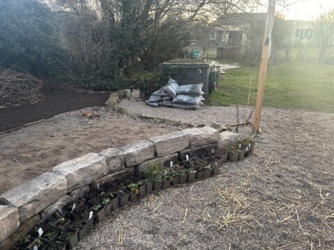 Die Trockenmauer ist fertig, das Magerbeet vorbereitet für die Pflanzen. Die Wildstauden warten.