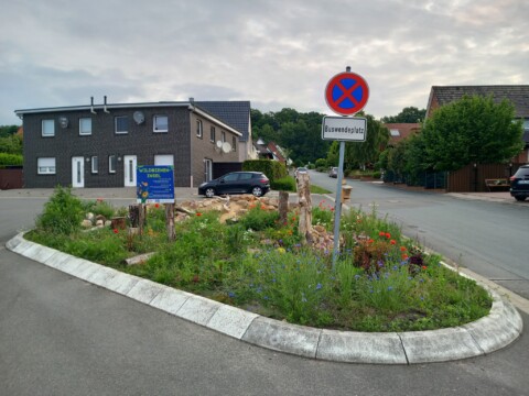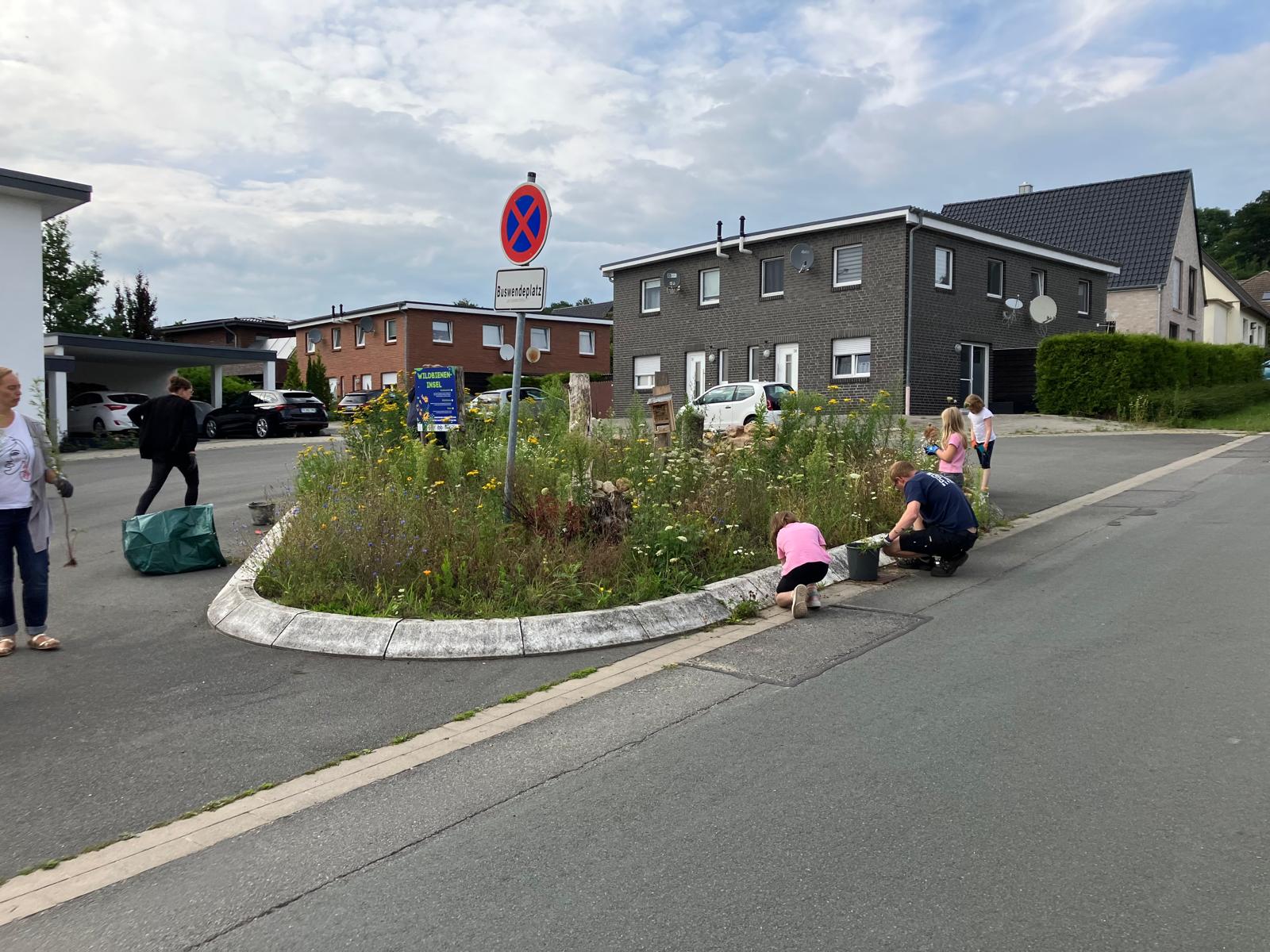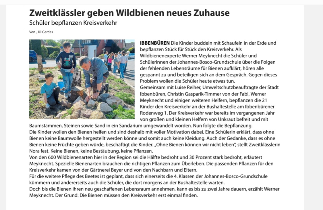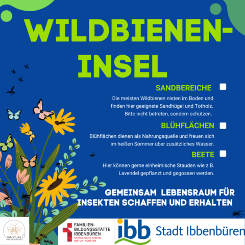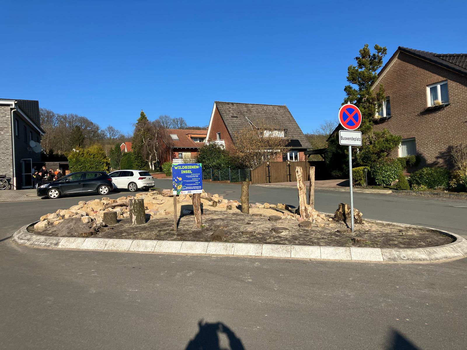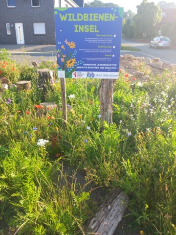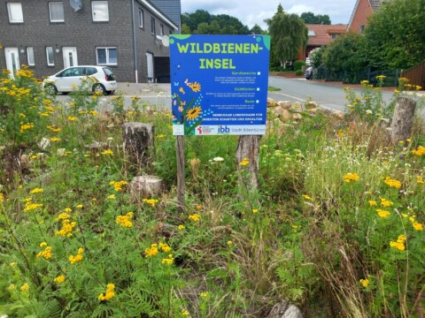Im Rahmen einer Aktion der Familienbildungststätte Ibbenbüren in Kooperation mit der Stadt Ibbenbüren und der Innature Initiative und den angemeldeten Helfer/innen wurde im Oktober 2024 eine brachliegende Verkehrsinsel auf einer Grundschulbushaltestelle zu einer Wildbieneninsel umgearbeitet: der Bauhof trug vorbereitend die Grasnarbe ab und die Umweltschutzbeauftrage kümmerte sich um Totholz, Steine und Sand.