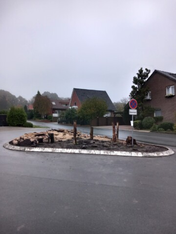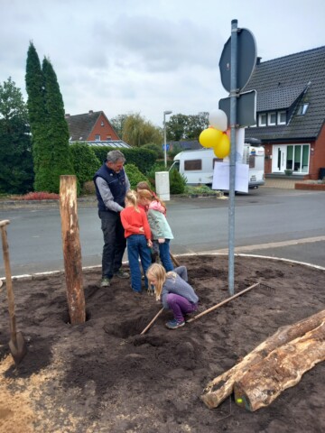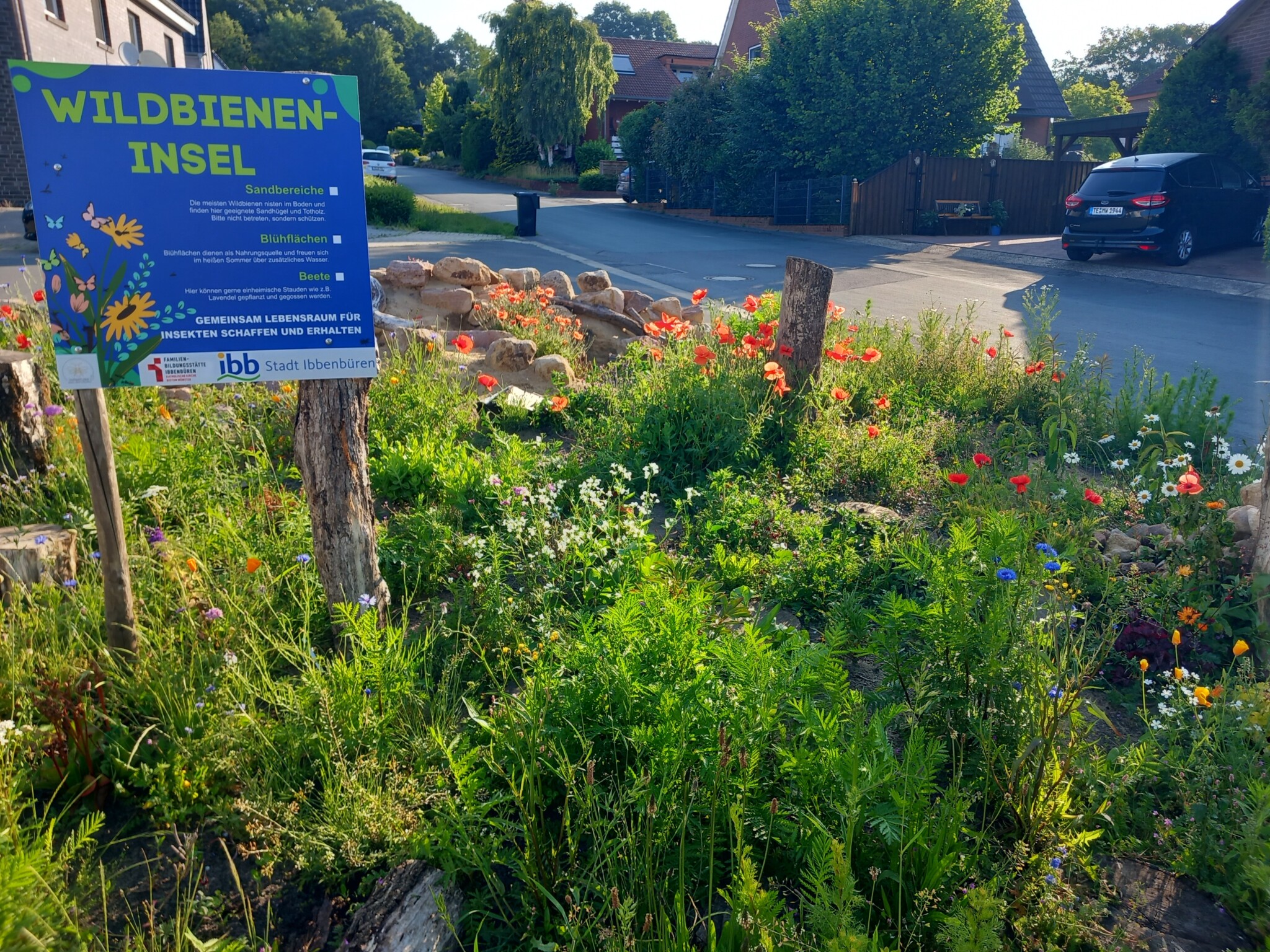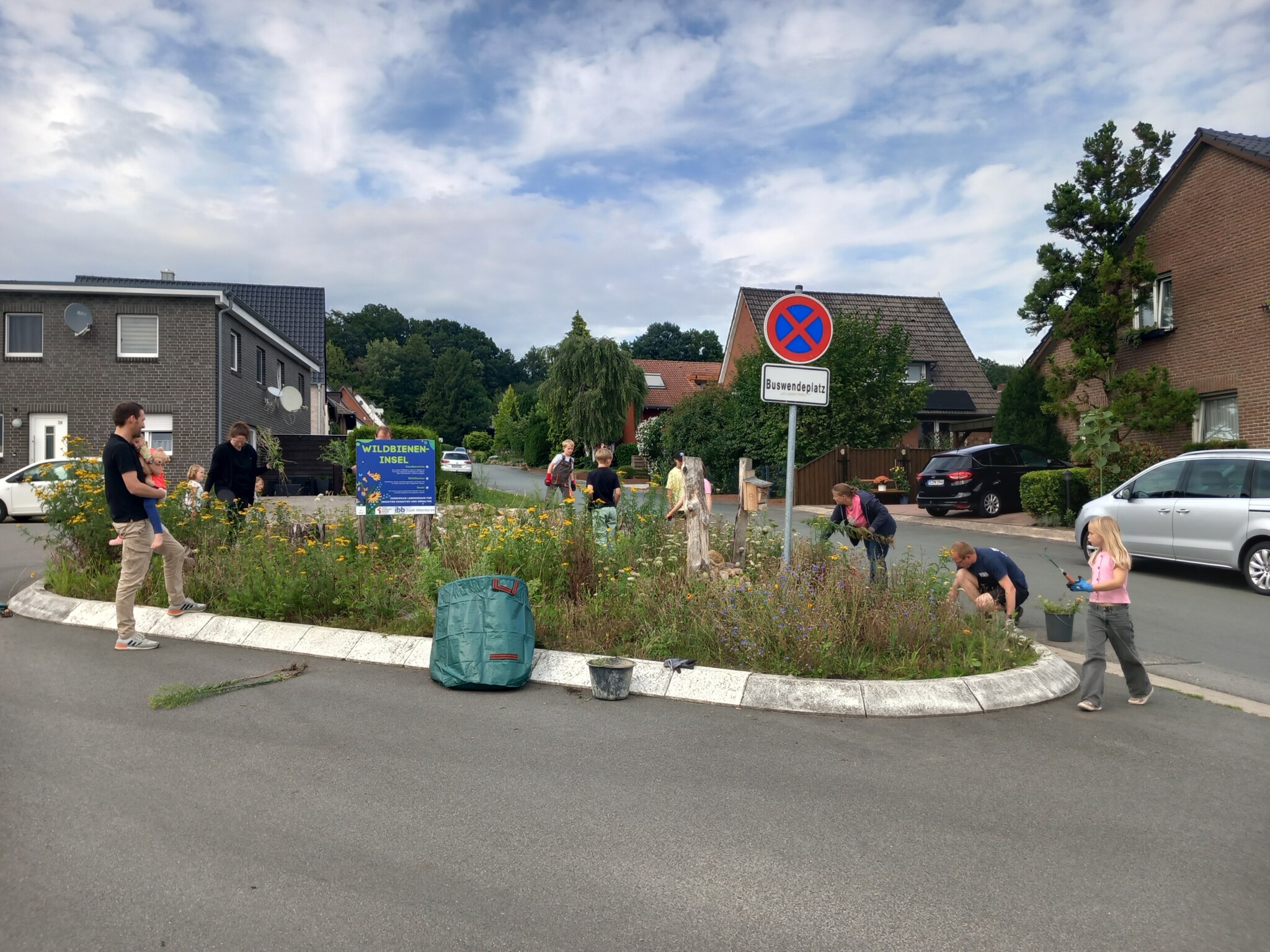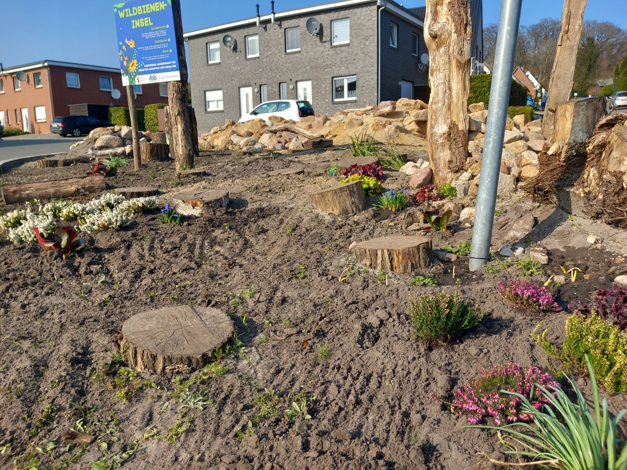 Im Rahmen einer Aktion der Familienbildungststätte Ibbenbüren in Kooperation mit der Stadt Ibbenbüren und der Innature Initiative und den angemeldeten Helfer/innen wurde im Oktober 2024 eine brachliegende Verkehrsinsel auf einer Grundschulbushaltestelle zu einer Wildbieneninsel umgearbeitet: der Bauhof trug vorbereitend die Grasnarbe ab und die Umweltschutzbeauftrage kümmerte sich um Totholz, Steine und Sand.