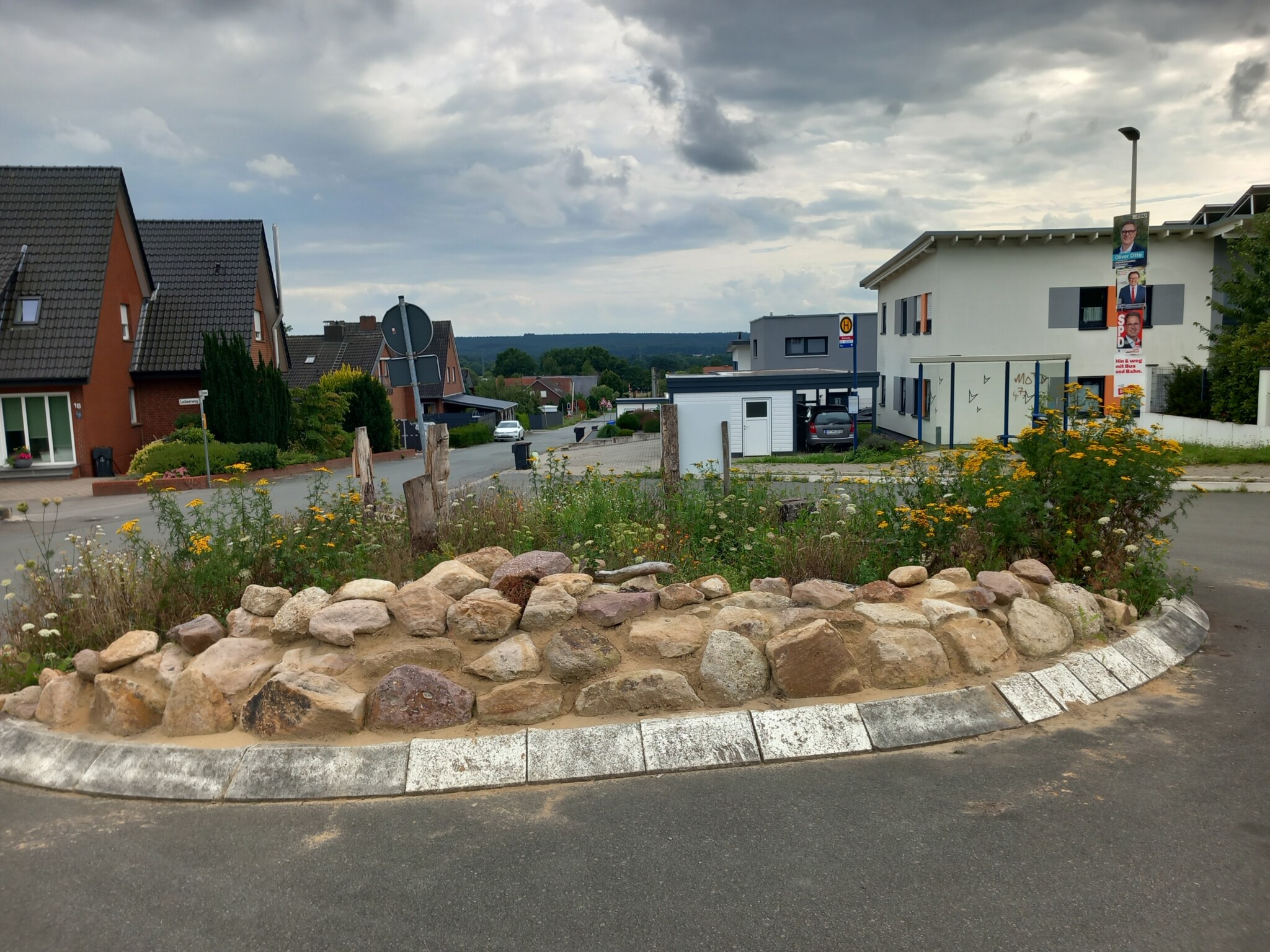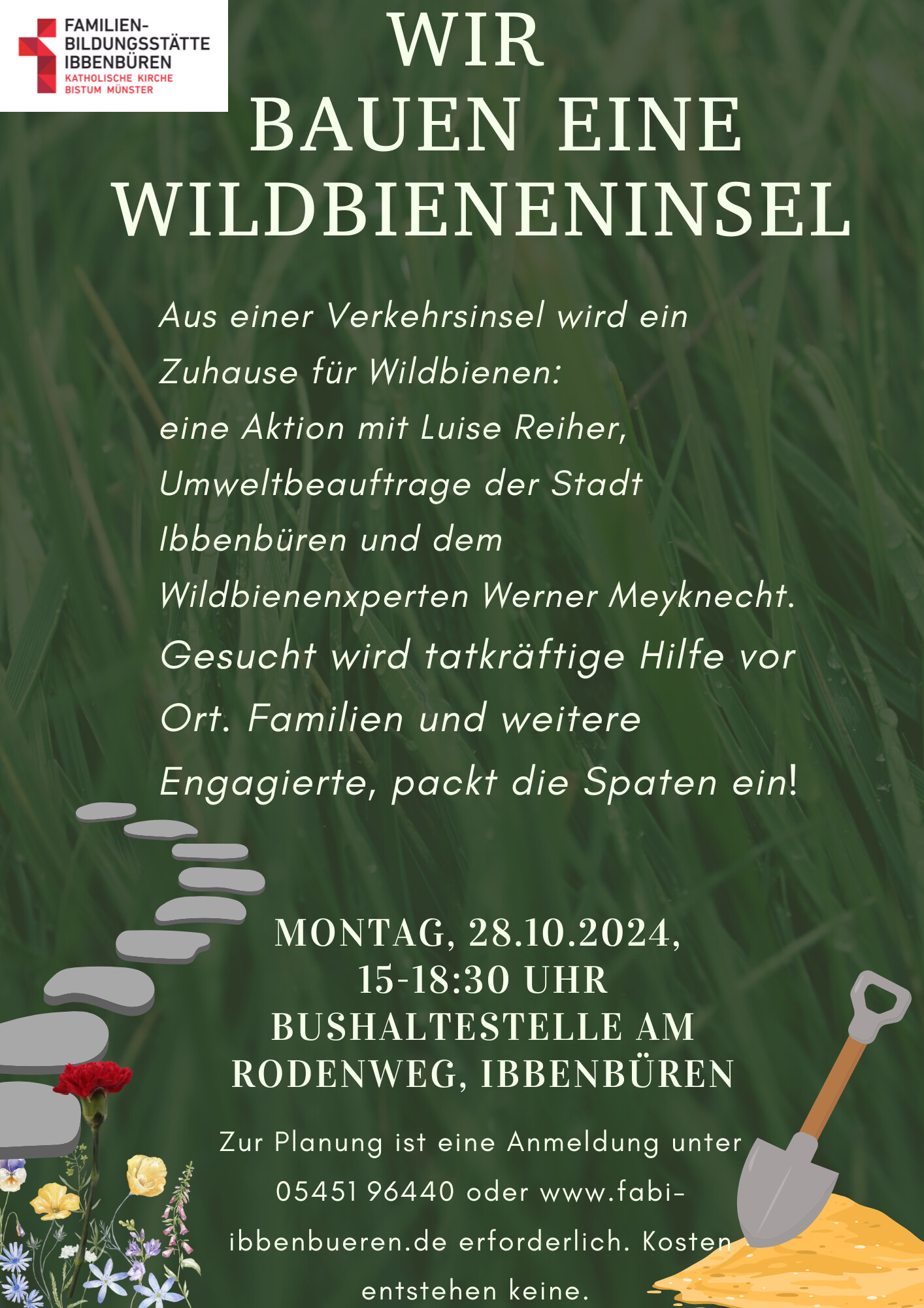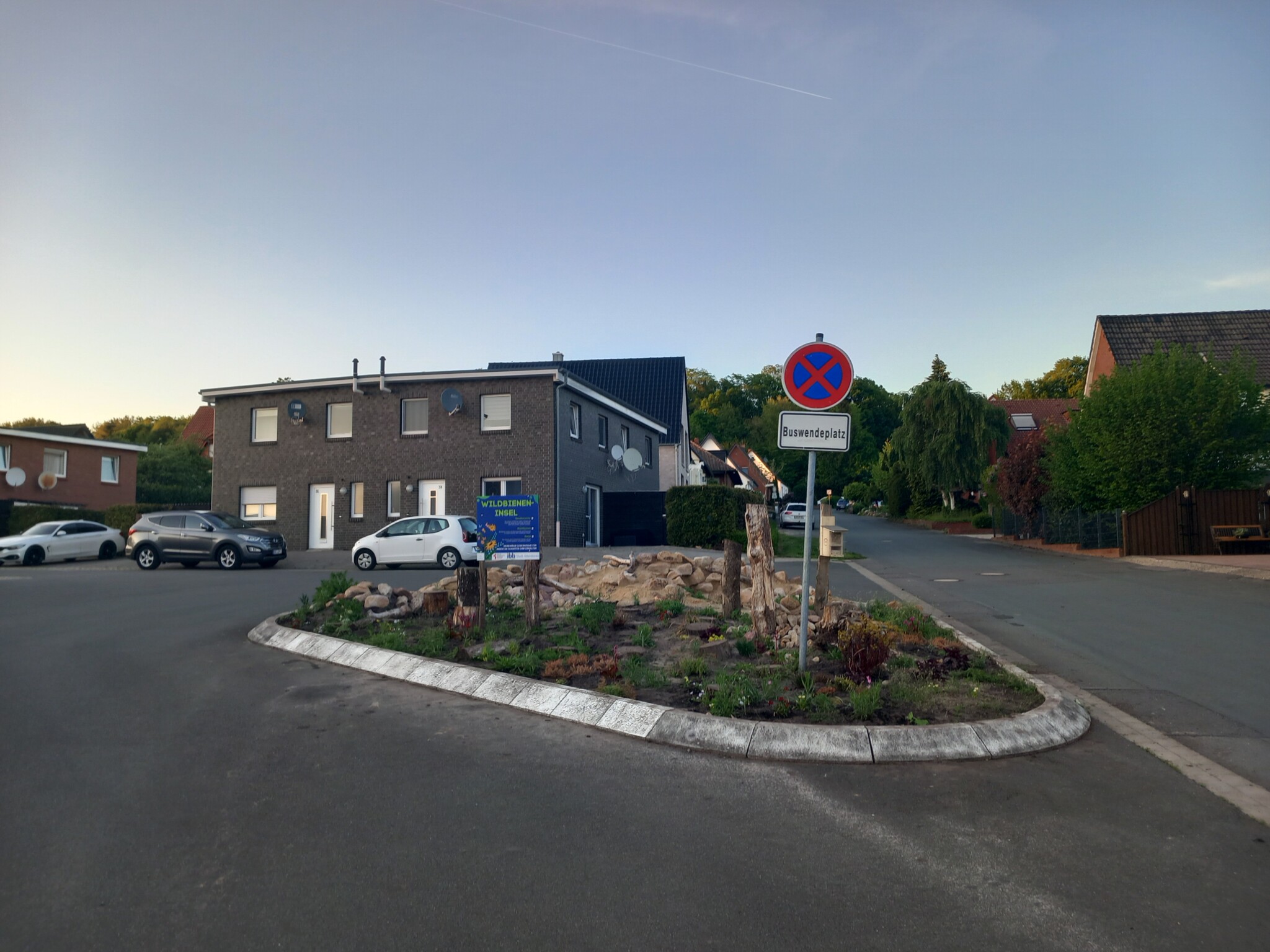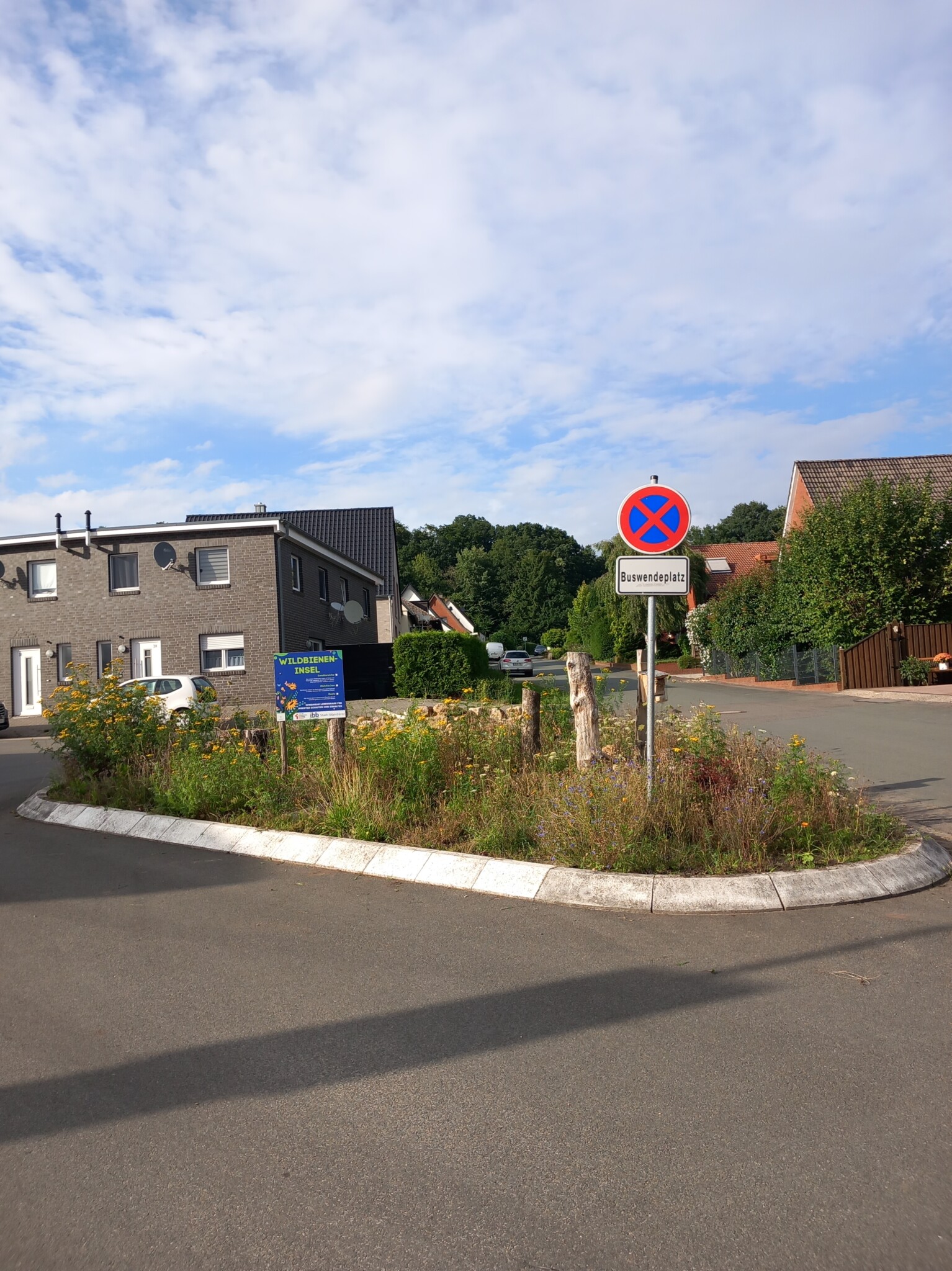 Im Rahmen einer Aktion der Familienbildungststätte Ibbenbüren in Kooperation mit der Stadt Ibbenbüren und der Innature Initiative und den angemeldeten Helfer/innen wurde im Oktober 2024 eine brachliegende Verkehrsinsel auf einer Grundschulbushaltestelle zu einer Wildbieneninsel umgearbeitet: der Bauhof trug vorbereitend die Grasnarbe ab und die Umweltschutzbeauftrage kümmerte sich um Totholz, Steine und Sand.