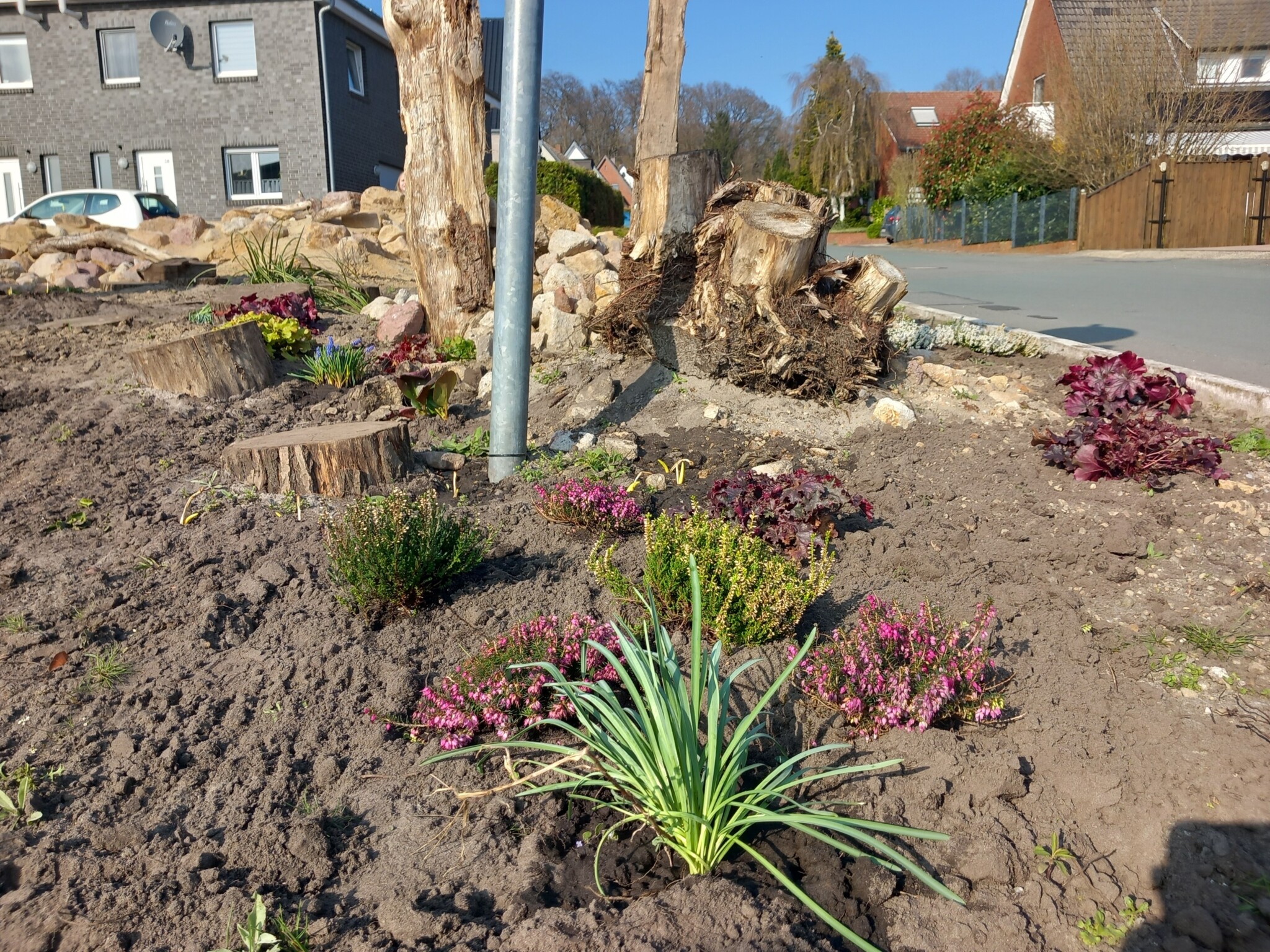 Die Neugier bei den Schulkindern und Anwohner/innen war geweckt damit und die Baumstämme wurden als Trittsteine gerne benutzt. Erste Samen wurden gesäht und ein paar erste Pflanzenspenden eingesetzt. Im Januar wurde dann das provisorische Schild durch ein solides Schild ersetzt, eine Eyecatcher entworfen von der FaBi, versehen mit allen Logos und von der Stadt Ibbenbüren finanziert, wurde es im Januar ehrenamtlich aufgestellt.