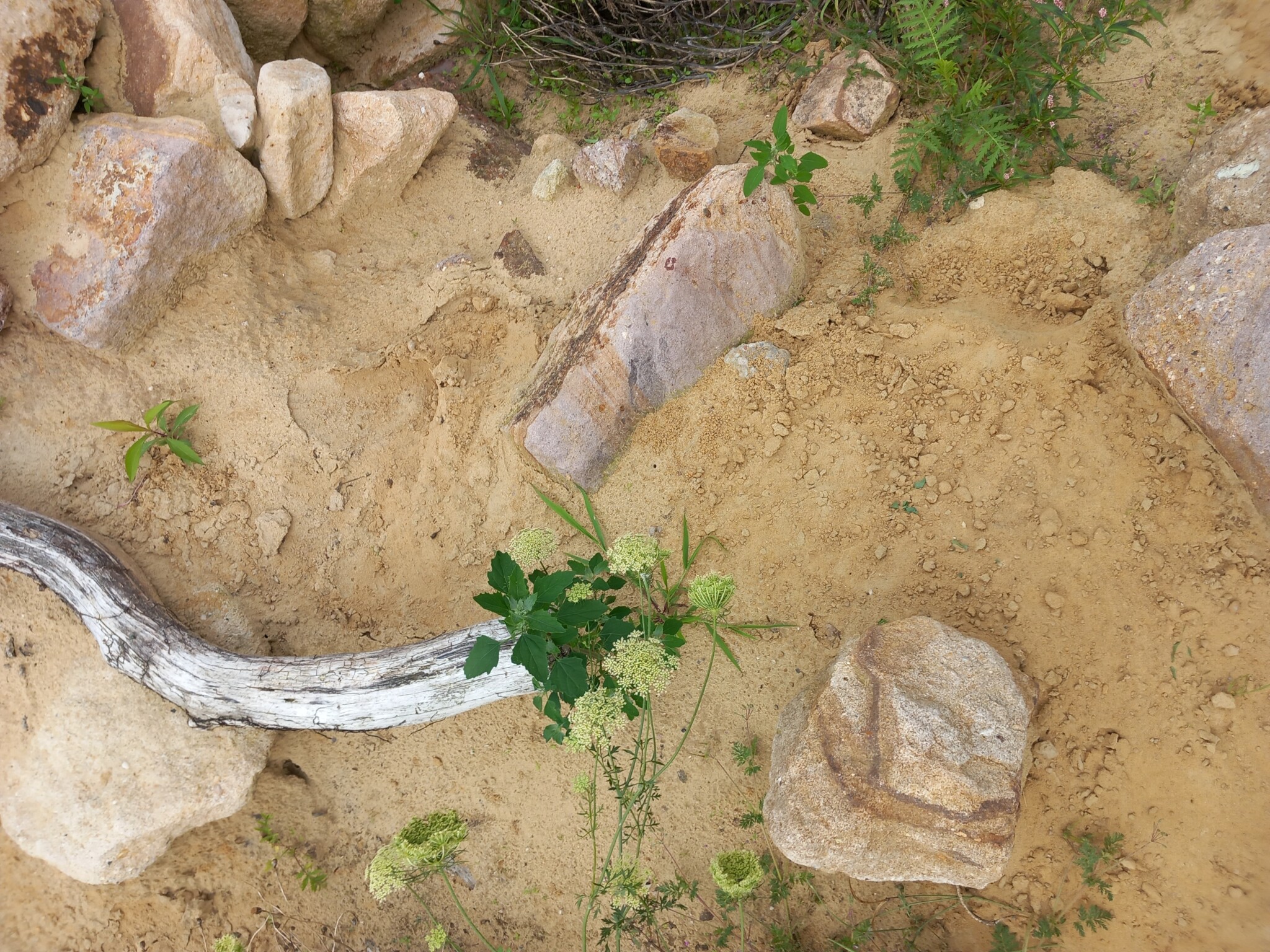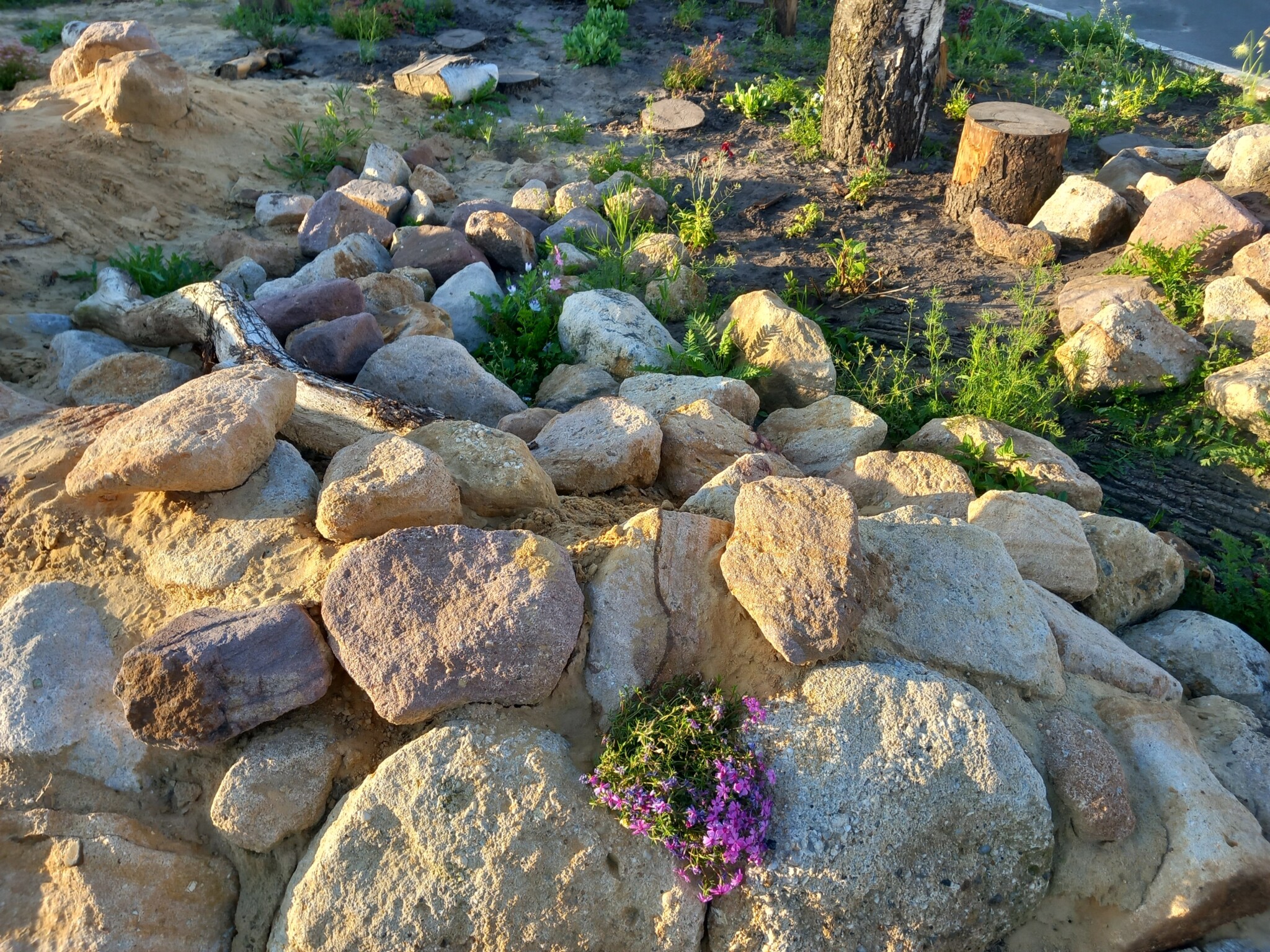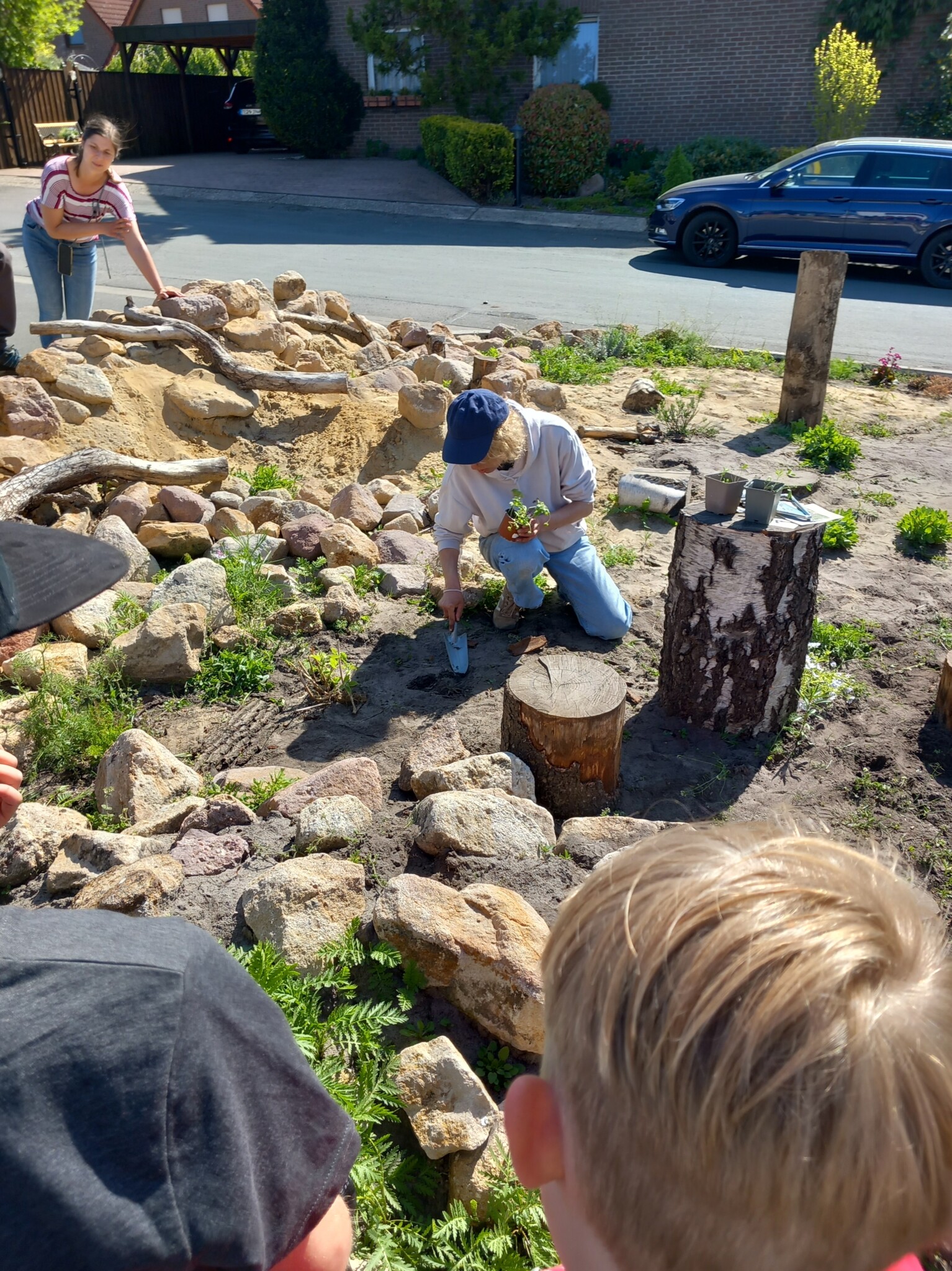 Zur Veranstaltung war öffentlich geworben worden und die Teilnahme war überschaubar: 8 Erwachsene und 7 Kinder. Dem Regen trotzten alle Engagierten und schufen tolle Strukturen mit den Materialspenden: eine Sandlinse, eine Sandsteinmauer, Beetflächen, eine große Baumwurzel aus Nachbars Garten und Baumscheiben als Trittweg wurden eingesetzt.
