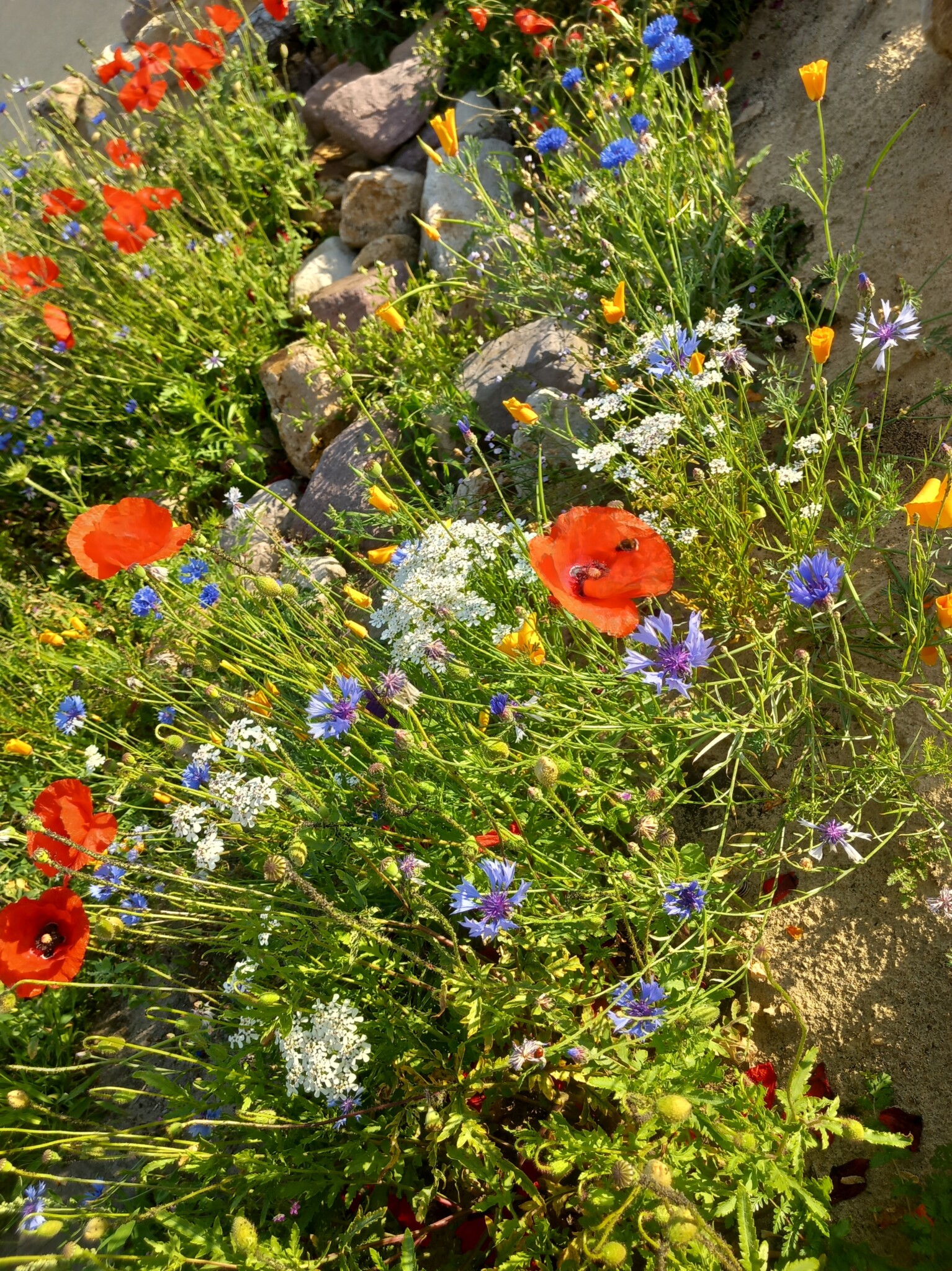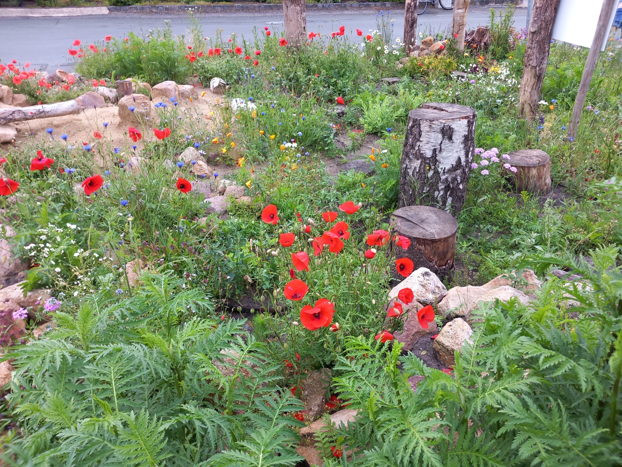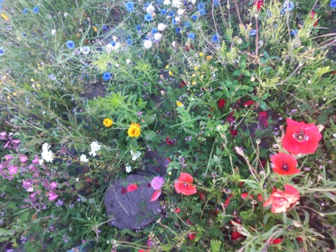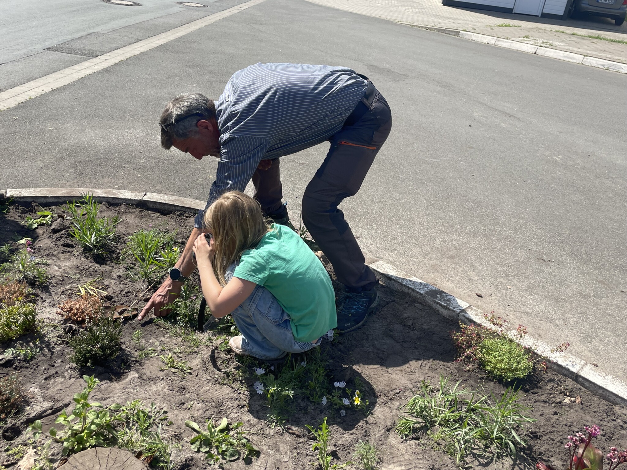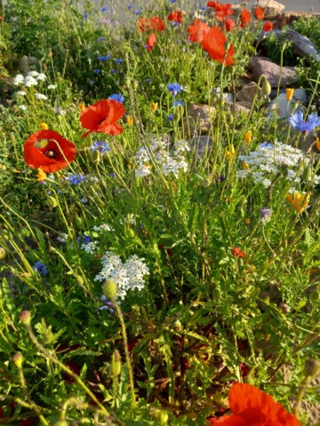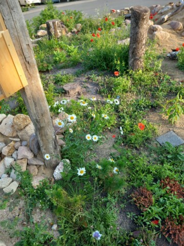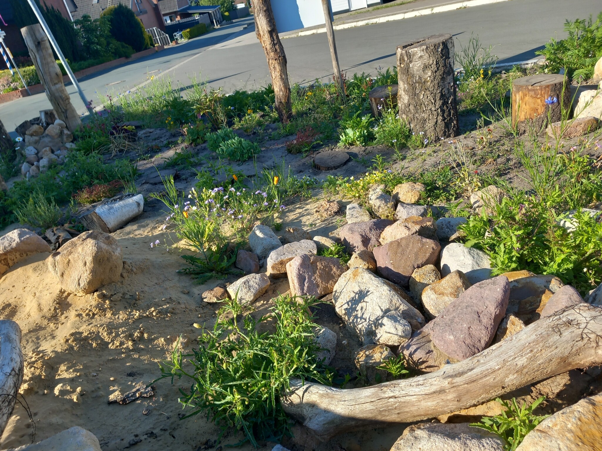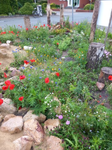 Fortan war der Mai sehr trocken und es bildeten sich Gießinitiativen und auch eigeninitiierte kleinere Pflanzaktionen in der Siedlung. Vor allem die Kinder aus der Siedlung waren sehr aktiv, wobei dazu zu sagen ist, dass keines der Kinder direkt in der Nähe der Wildbieneninselwohnt und teilweise weite Wege mit Bollerwagen und Gießkannen auf sich genommen wurden. Viele Pflanzen haben das Frühjahr überstanden, obwohl die Insel an sonnigen Tagen komplett von der Sonne beschienen wird.