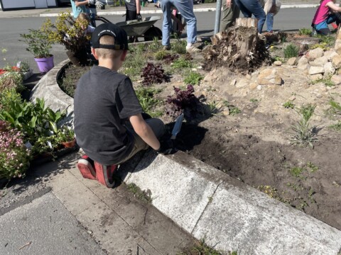 Durch die Siedlungskinder und die Schulbushaltestelle entstand die Idee der Kooperation mit einer Schulklasse und die Projektgruppe konnte sich ab April erweitern: Frau Decke-Stallmeyer mit ihrer Klasse 2b rückte einen Vormittag zur großen Pflanzaktion an. Dazu muss man sagen, dass die Kinder einen Marsch über 45 Minuten hinlegten. Zusammen mit Werner Meyknecht, Christin Gasparik-Timmer, Luise Reiher und Helfern von der Schule und der Elternschaft konnten die von der Ibbenbürener Gärtnerei Beyer gespendeten Pflanzen gepflanzt werden.