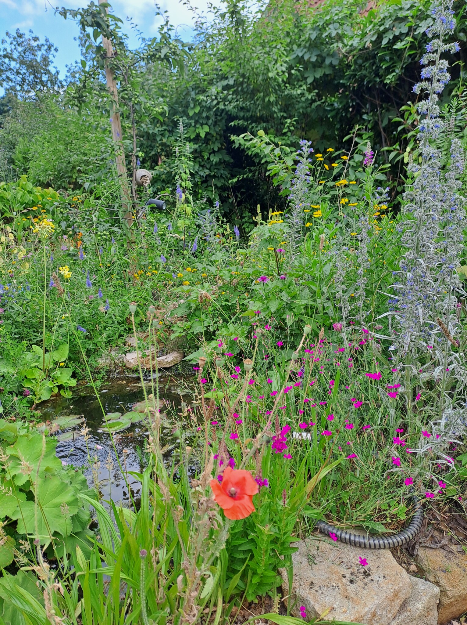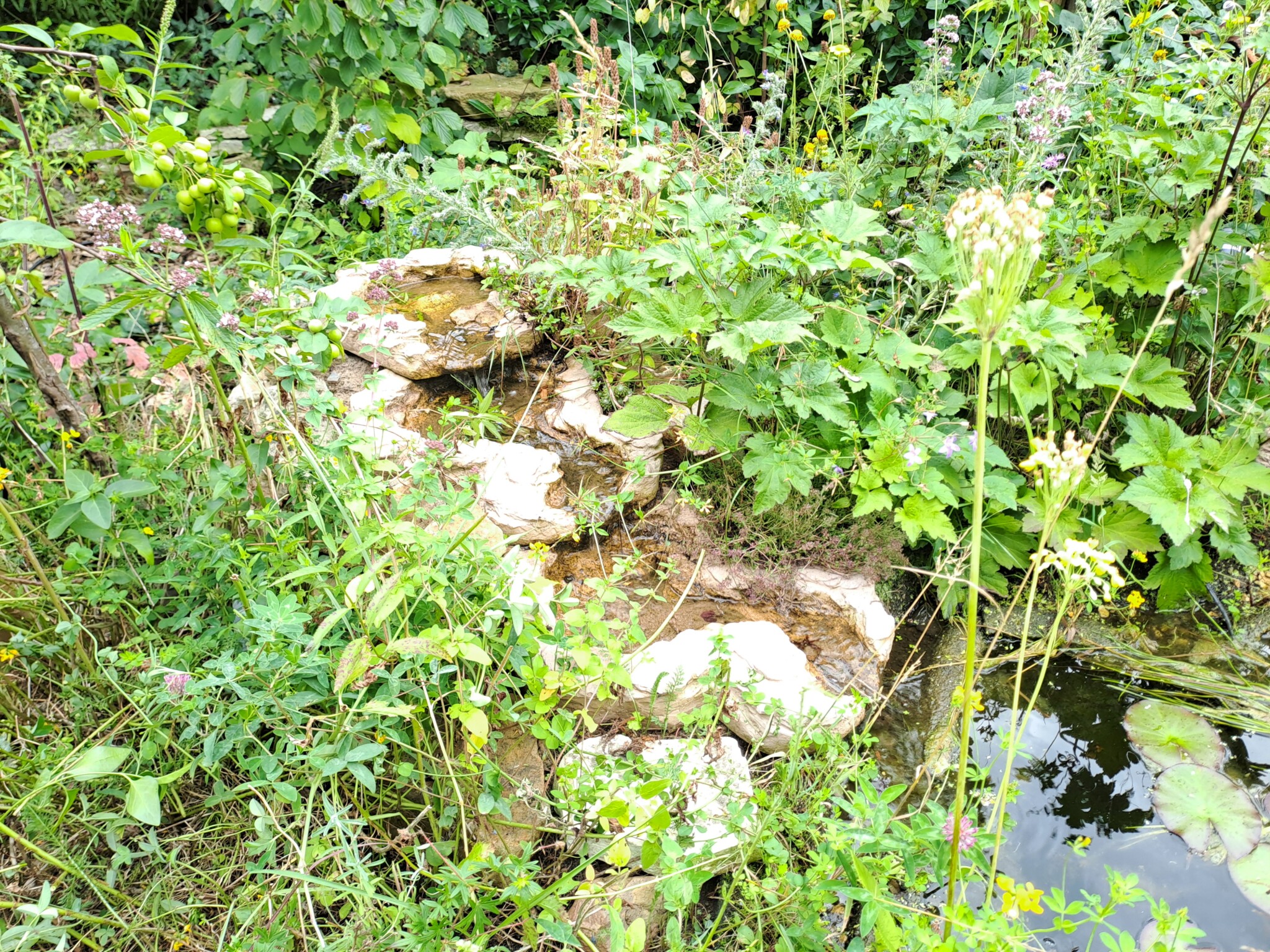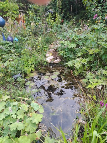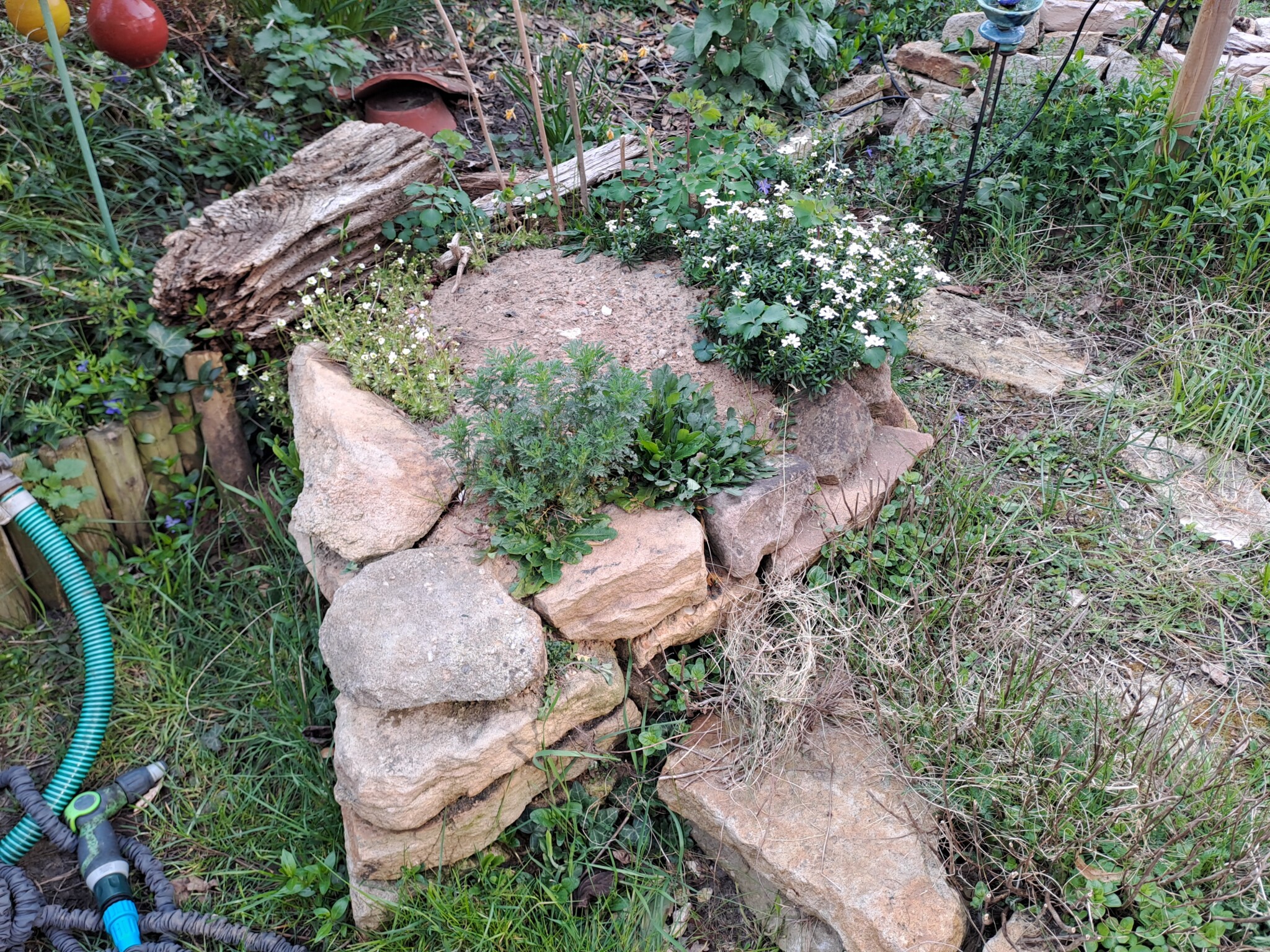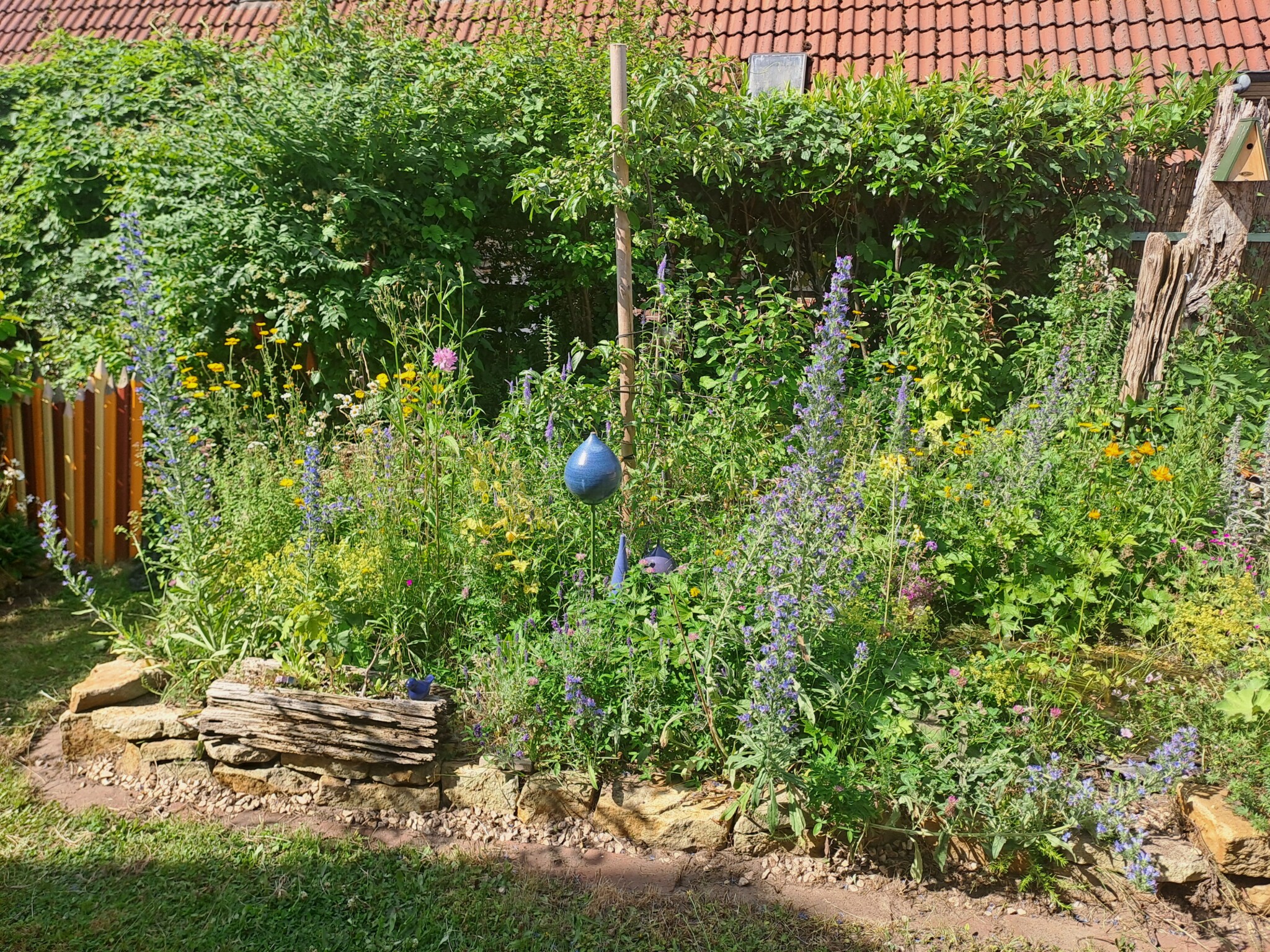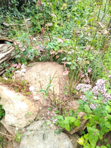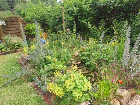 Als eines der letzten Flächen legten wir ein Sandbeet an, das wir mit einer Trockenmauer aus Ibbenbürener Sandstein umrandeten. In diesem Sandbeet entstand auch ein Sandarium für bodennistende Wildbienen. Natürlich bepflanzten wir es mit naturnahen, insektenfreundlichen Pflanzen, wie z.B. Wasserdost, Natternkopf etc. Außerdem entstand auch ein naturnah angelegter Teich mit einem Bachlauf. Vor allem die Vögel und Wildbienen nutzen die flachen Schalen des Baches zum Trinken und Baden.