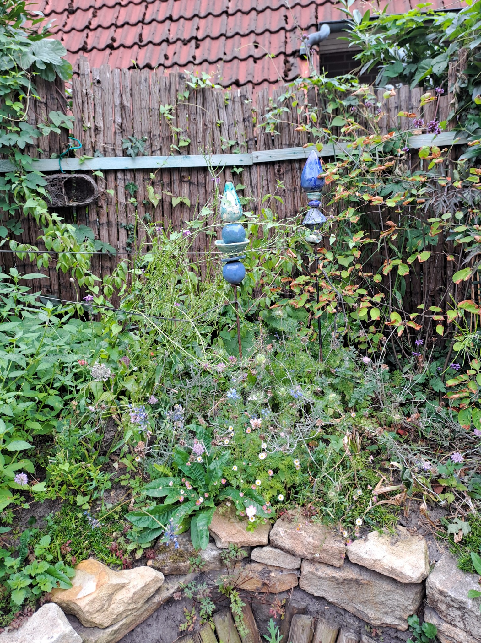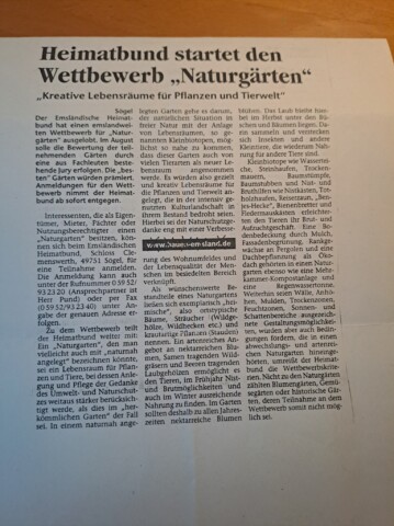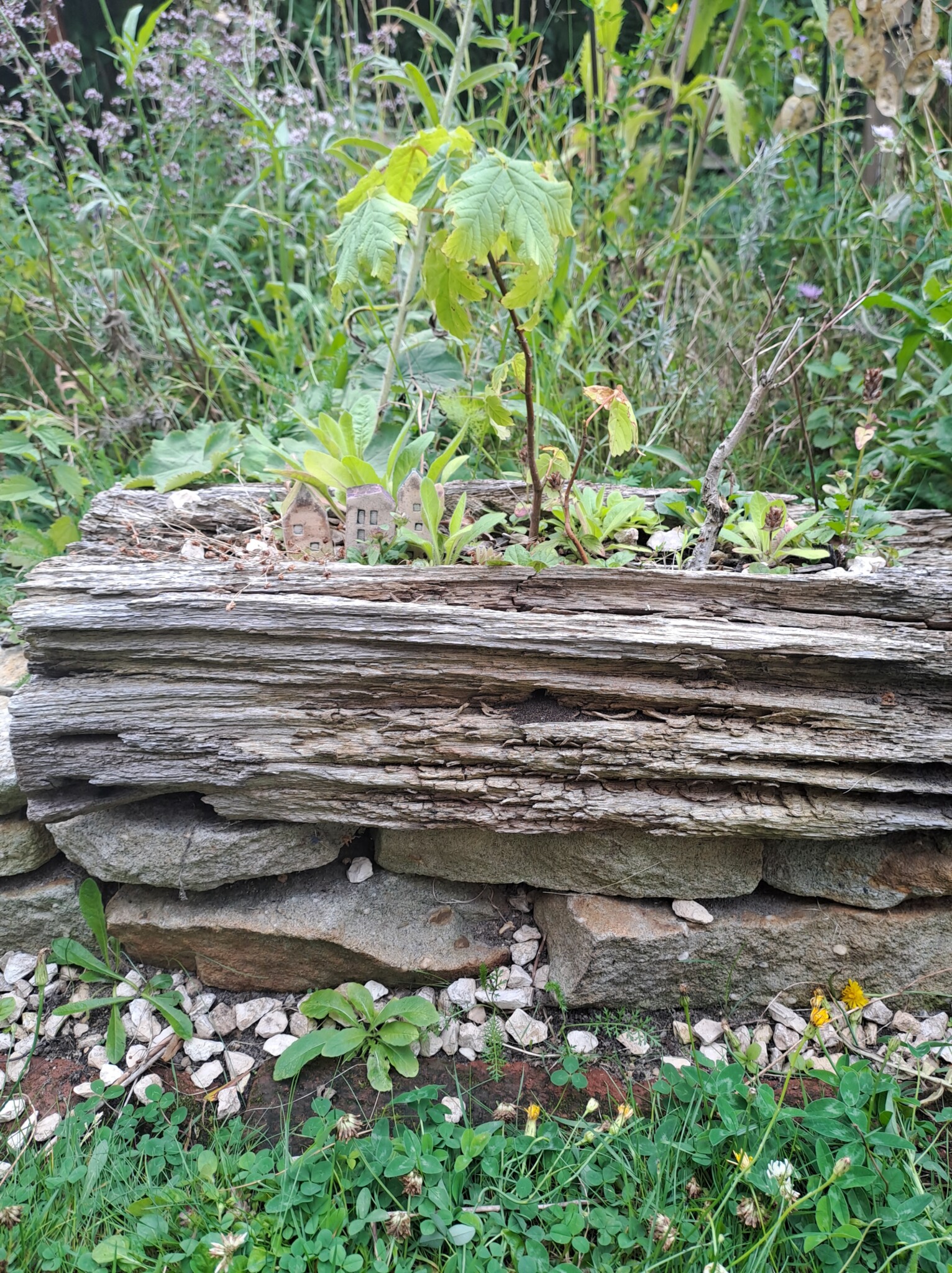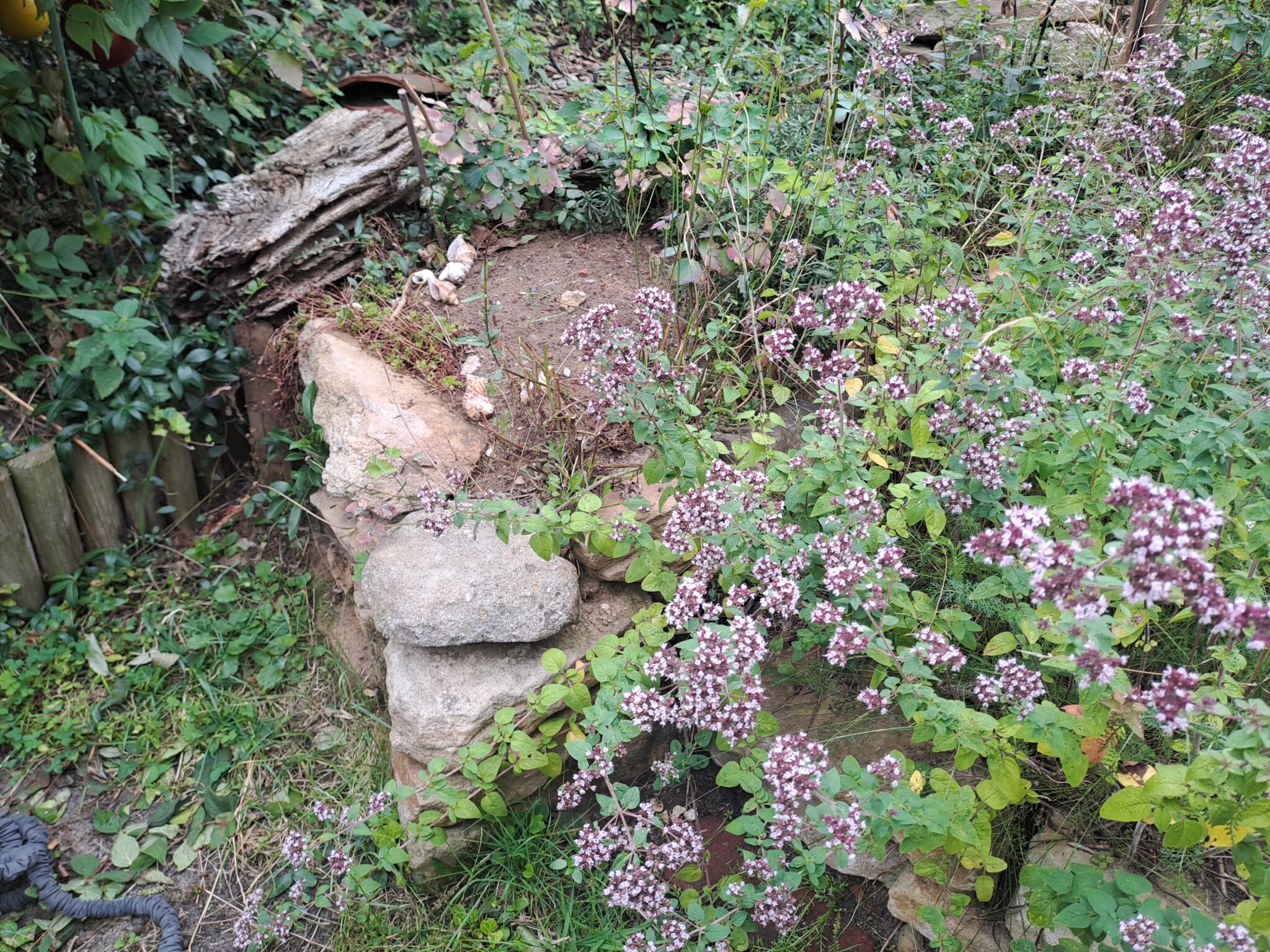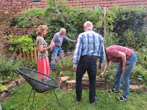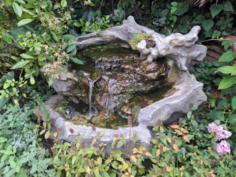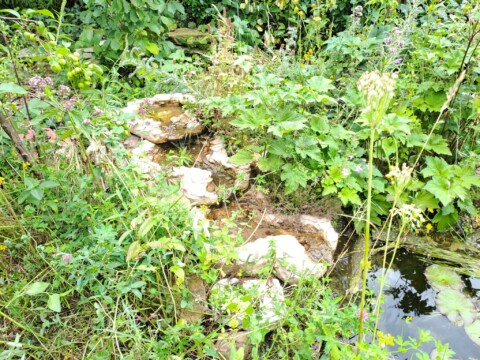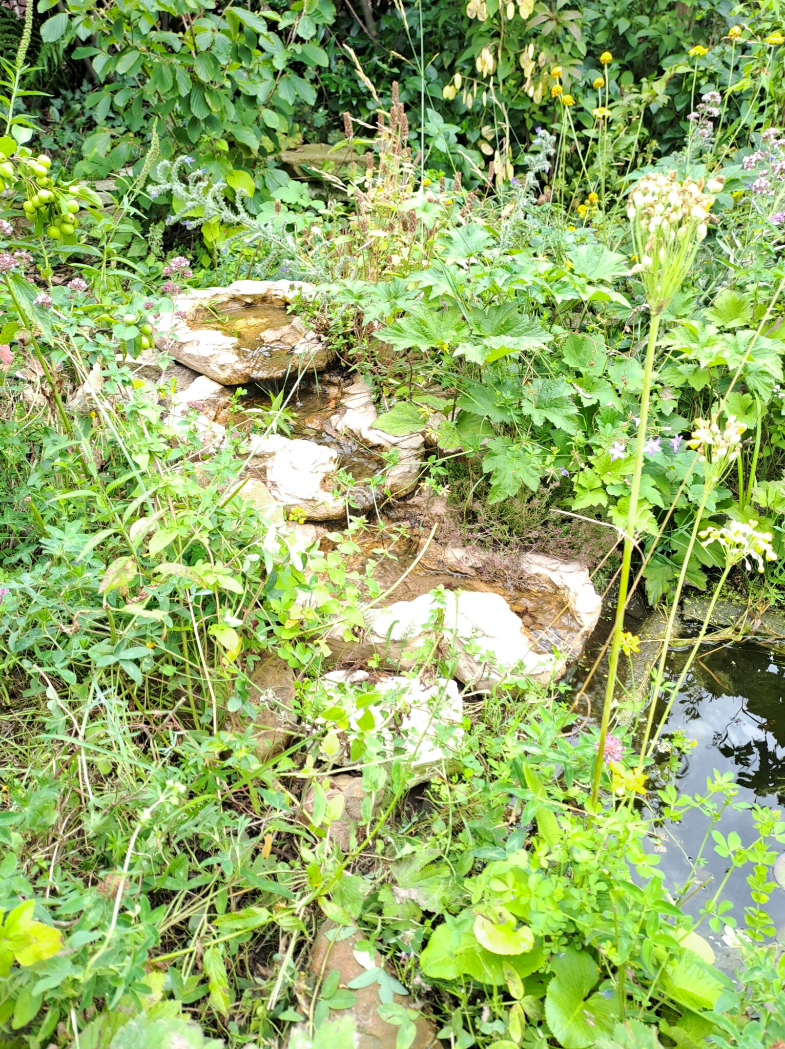 Als eines der letzten Flächen legten wir ein Sandbeet an, das wir mit einer Trockenmauer aus Ibbenbürener Sandstein umrandeten. In diesem Sandbeet entstand auch ein Sandarium für bodennistende Wildbienen. Natürlich bepflanzten wir es mit naturnahen, insektenfreundlichen Pflanzen, wie z.B. Wasserdost, Natternkopf etc. Außerdem entstand auch ein naturnah angelegter Teich mit einem Bachlauf. Vor allem die Vögel und Wildbienen nutzen die flachen Schalen des Baches zum Trinken und Baden.