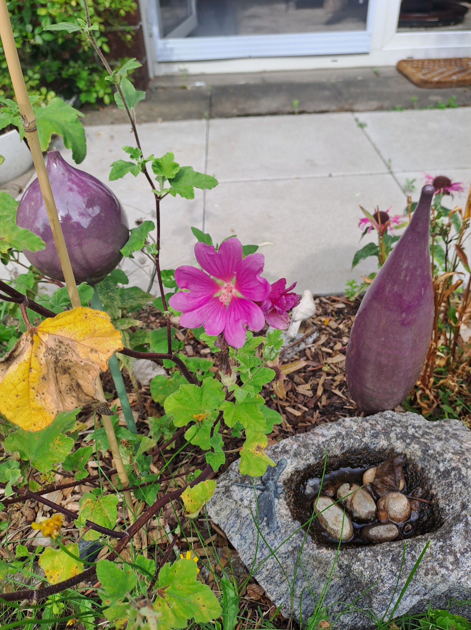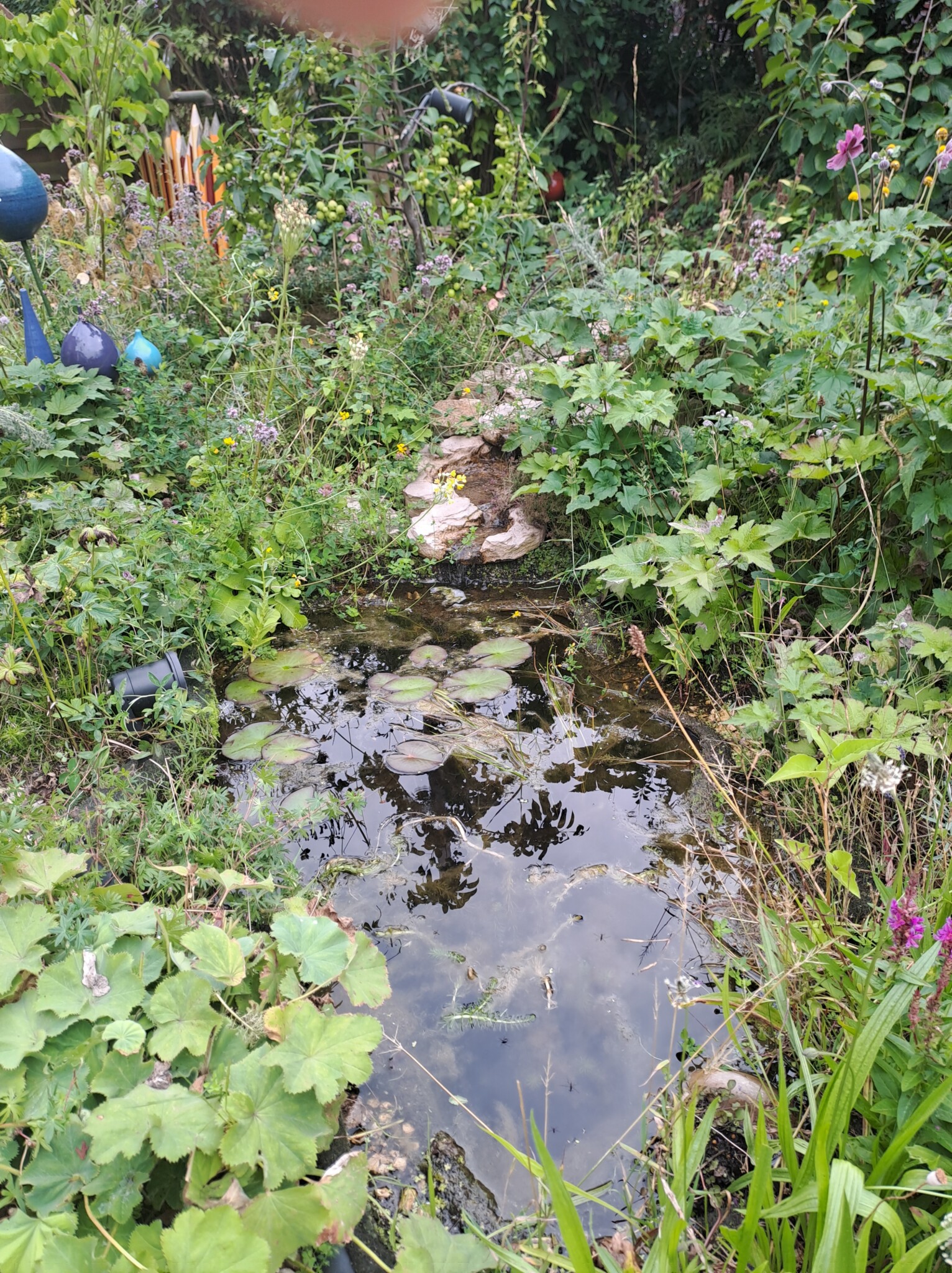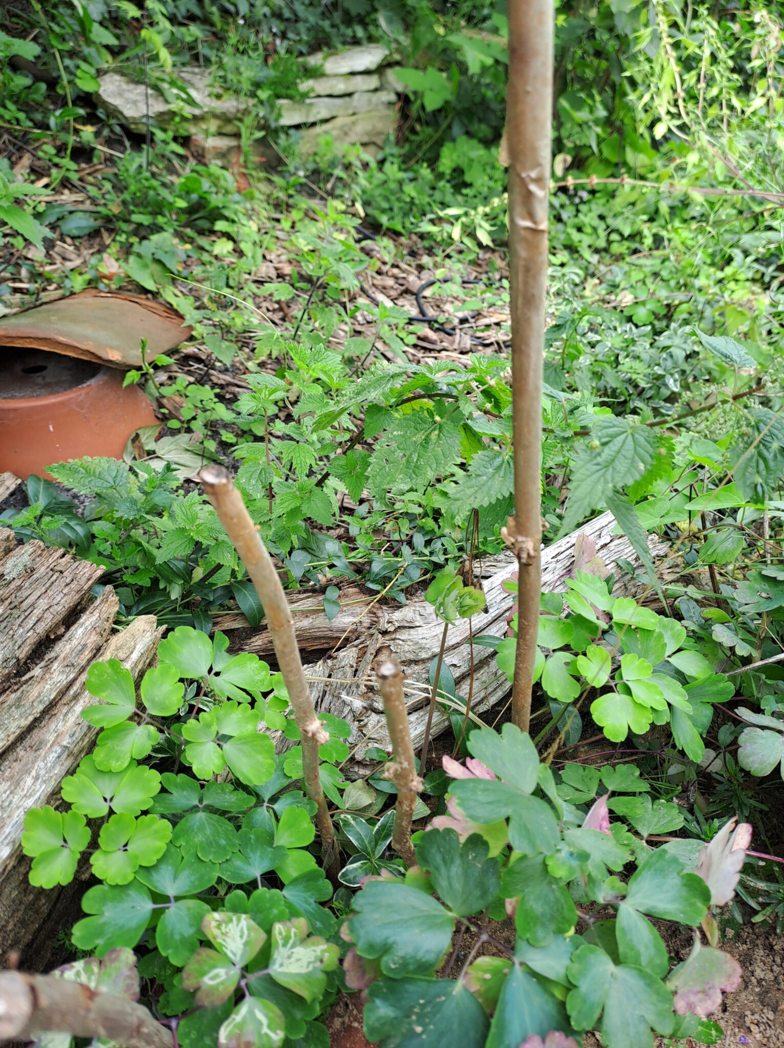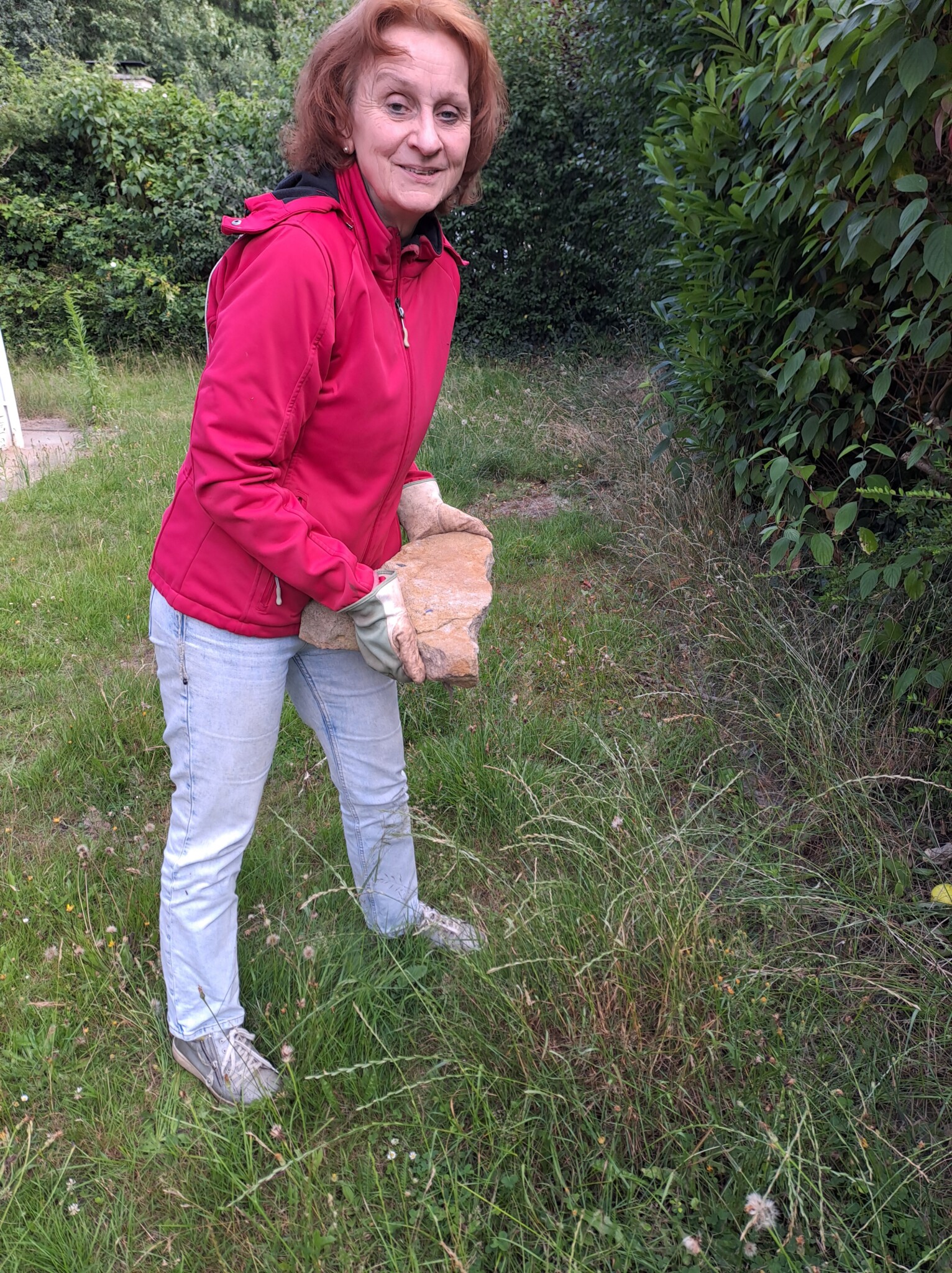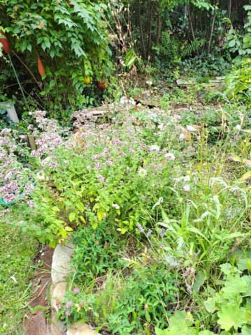 Als eines der letzten Flächen legten wir ein Sandbeet an, das wir mit einer Trockenmauer aus Ibbenbürener Sandstein umrandeten. In diesem Sandbeet entstand auch ein Sandarium für bodennistende Wildbienen. Natürlich bepflanzten wir es mit naturnahen, insektenfreundlichen Pflanzen, wie z.B. Wasserdost, Natternkopf etc. Außerdem entstand auch ein naturnah angelegter Teich mit einem Bachlauf. Vor allem die Vögel und Wildbienen nutzen die flachen Schalen des Baches zum Trinken und Baden.