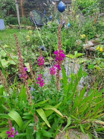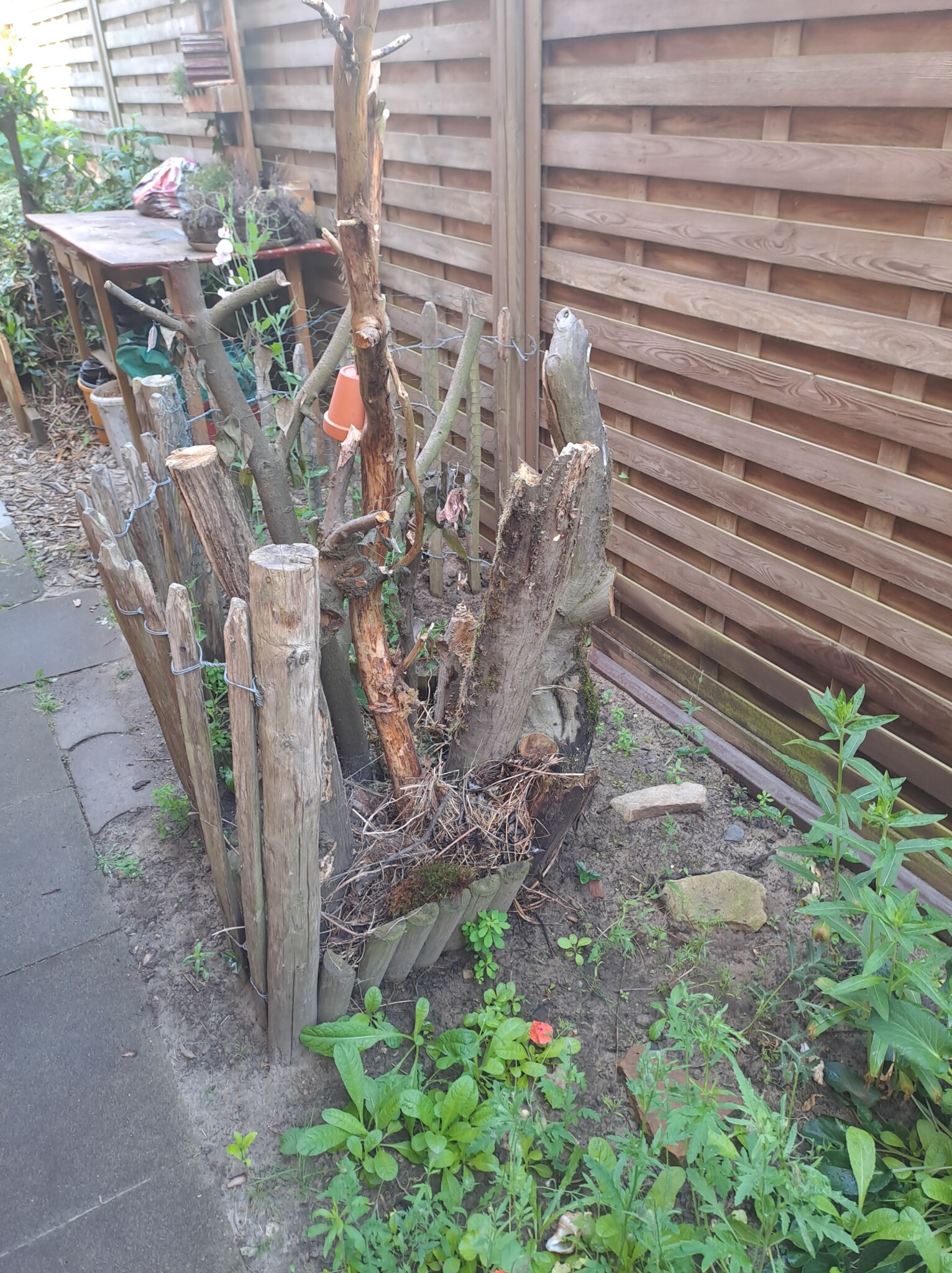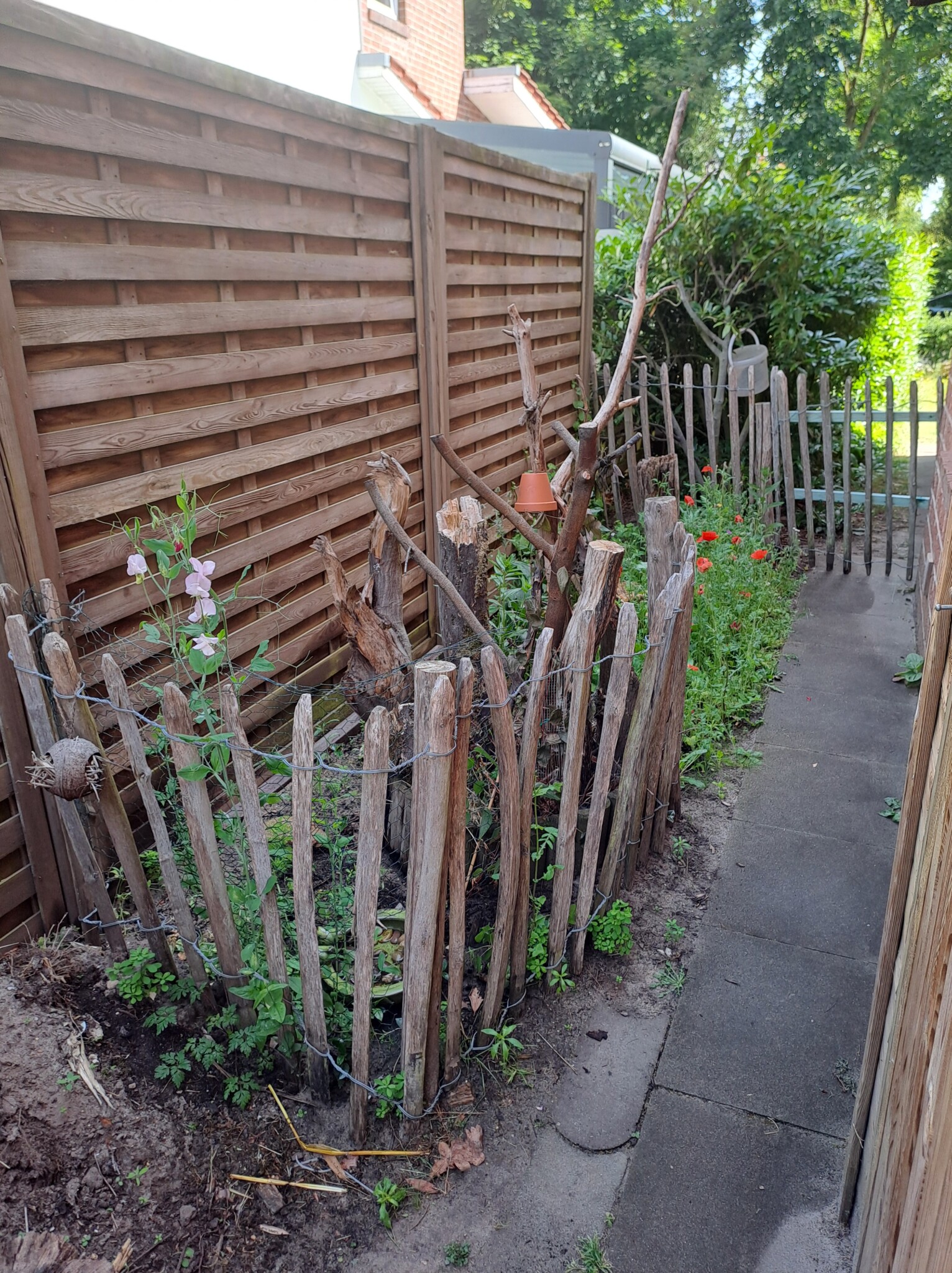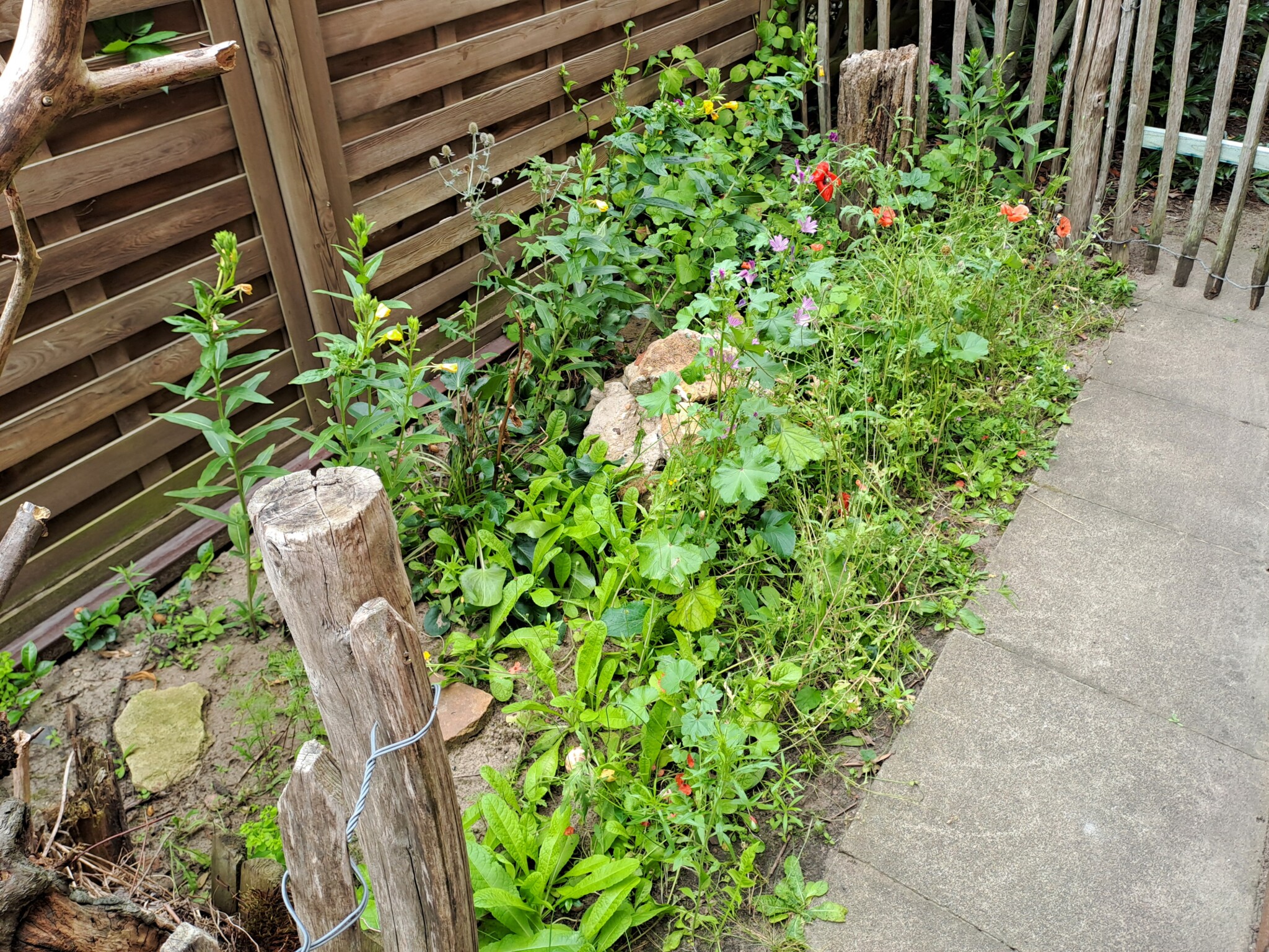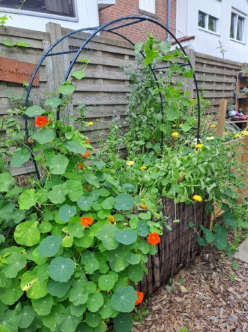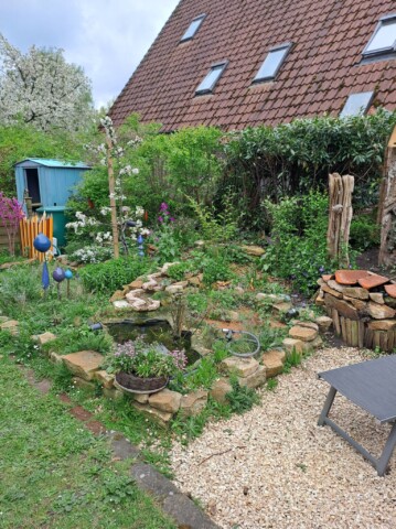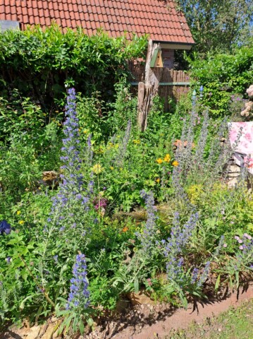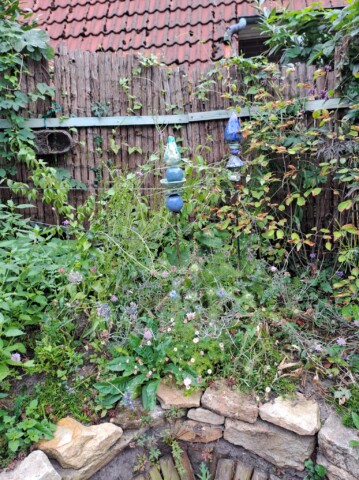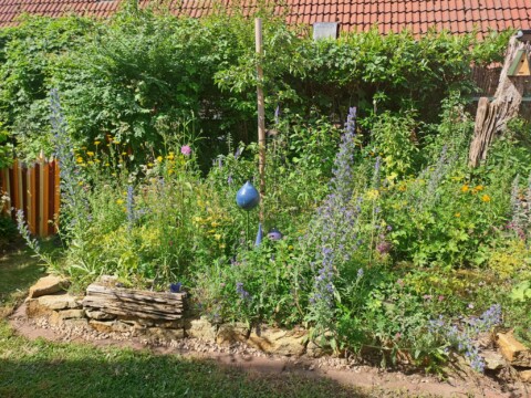 Der gesamte Garten ist ca. 100qm groß. Bei meinem Einzug gab es an der Grundstücksgrenze eine Kirschlorbeerhecke und davor eine Rasenfläche. Nach und nach haben wir in den letzten Jahren den Garten zu einem Naturgarten umgestaltet und mit insektenfreundlichen Gehölzen und Stauden bestückt. Auch ein Wildblumensaum entstand.