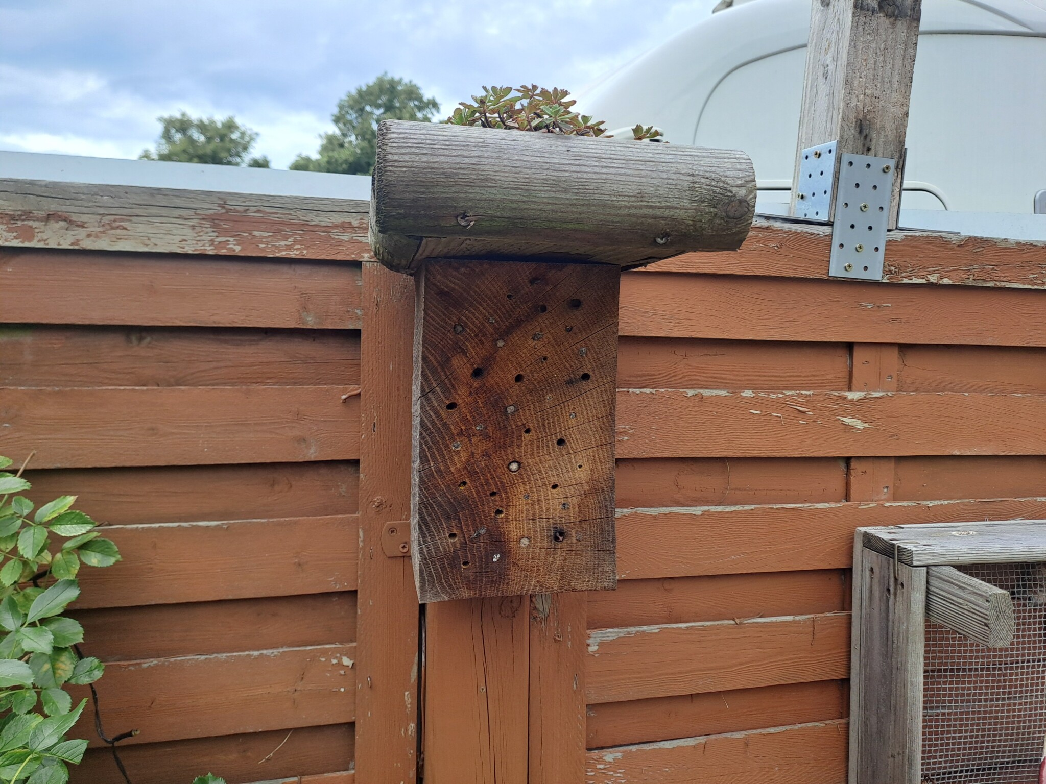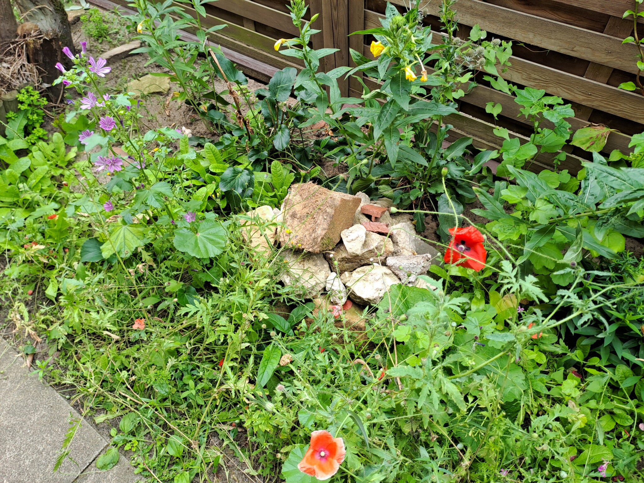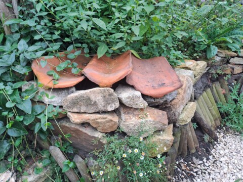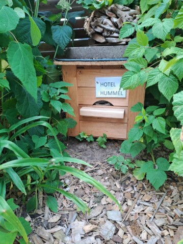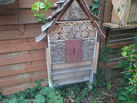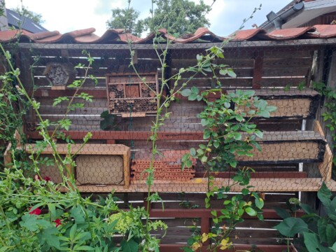 Bei der Umgestaltung entstanden zahlreiche Insektenunterkünfte für hohlraumnistende Wildbienen (Wildbienenhotels aus Strangfalzziegeln, Lehmwänden, Insektenhotels, Trockenmauern, Totholz, Steinhaufen, Aufstellen von Himbeerruten). Außerdem legten wir einen Hummelkeller an und bauten einen Hummelkasten. Für die Käfer entstand ein Käfermeiler. Auch an die Nachtfalter wurde gedacht und ein eigenes Beet entsprechender Bepflanzung (Nachtviolen, Nachtkerzen etc.) angelegt.