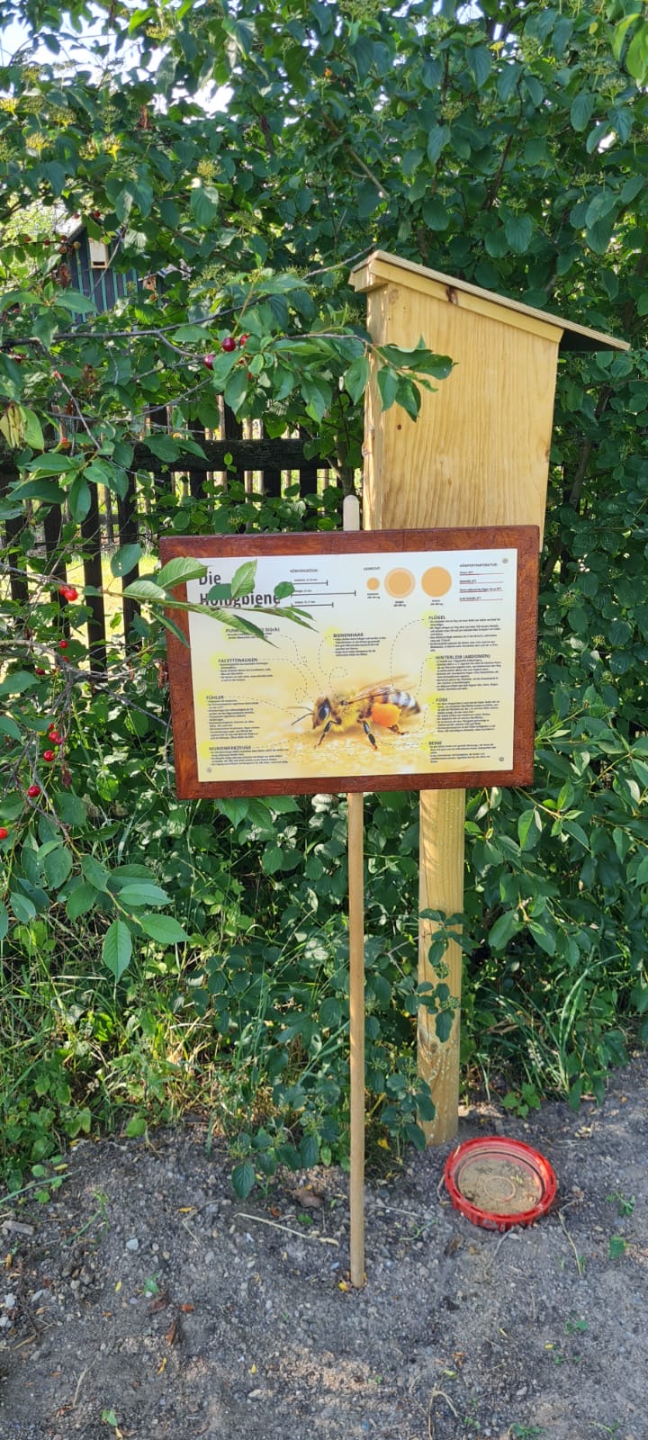 Infotafel „Die Honigbiene“ vor dem Bienen-Nistblock