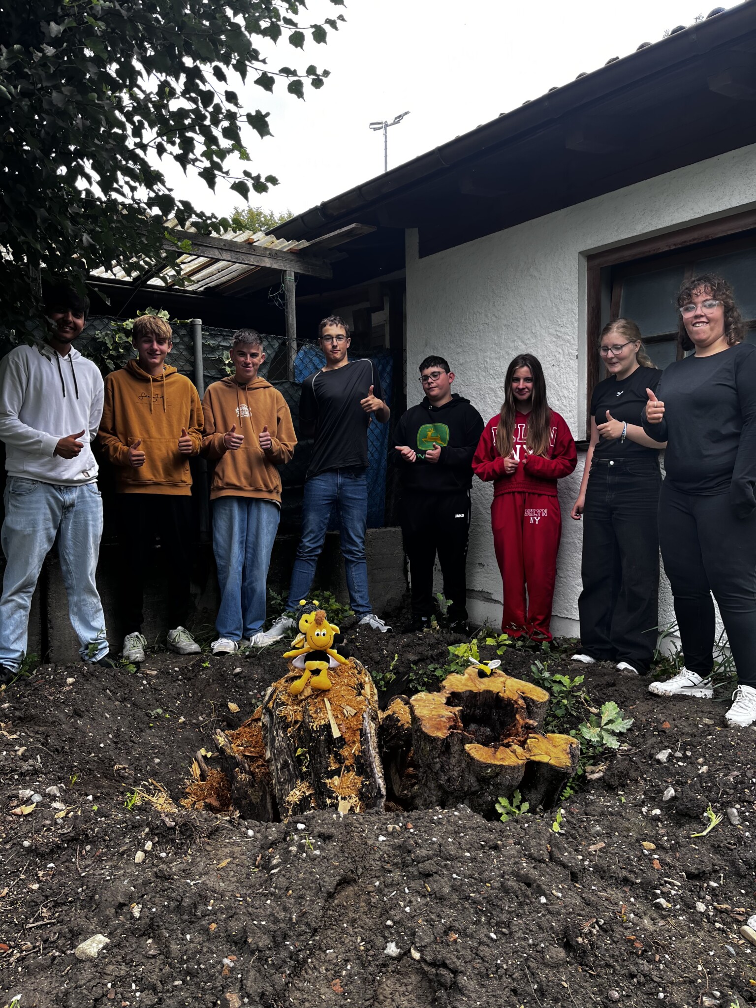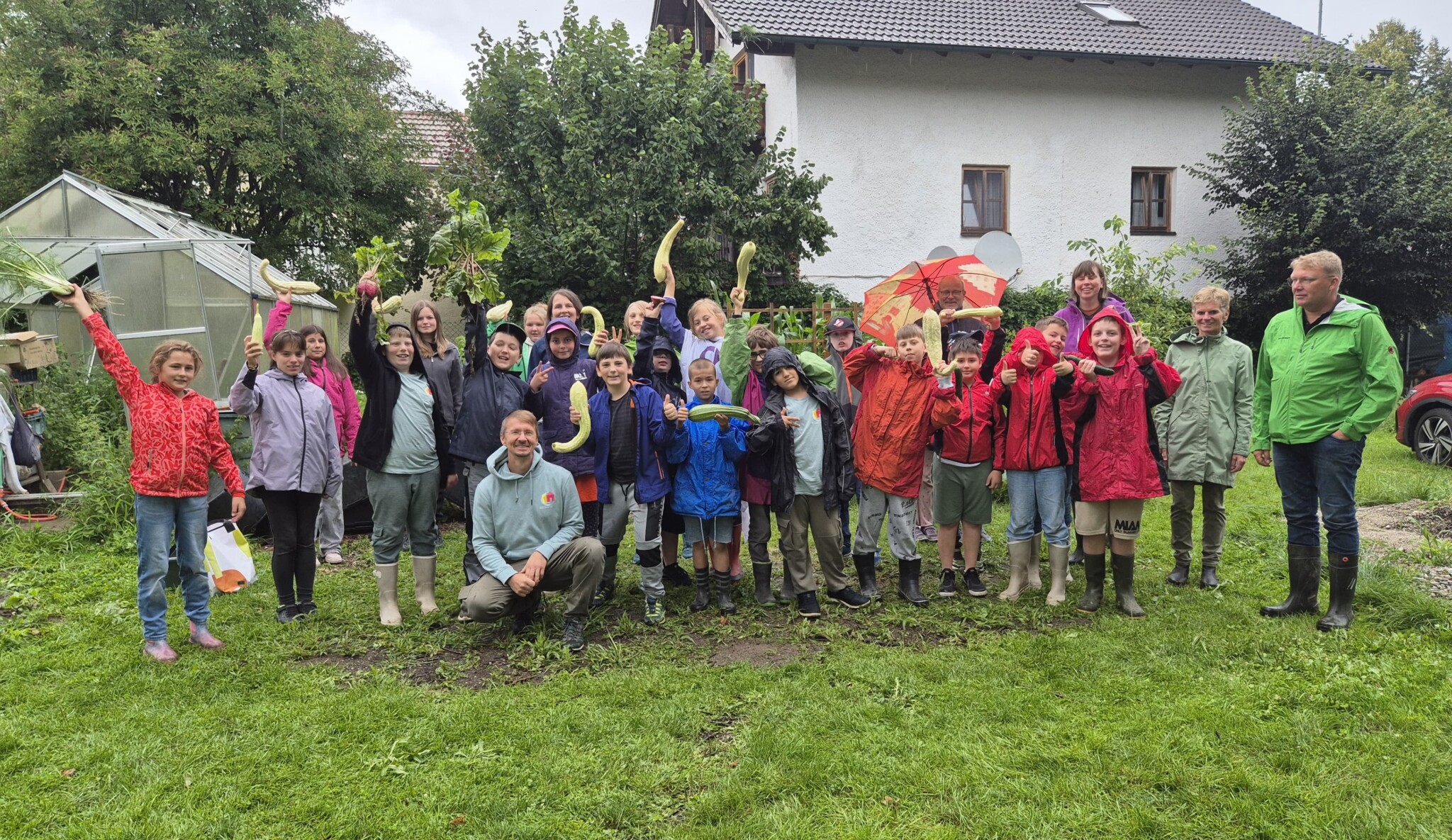 Von Schulvorbereitung – 9. Klasse. Gesamte Schulfamilie (mehrere Lehrer, Hausmeister, Schulleitung, Betreungskräfte im Ganztag), Landschaftspfleger Rafael Dengler und unser Acker Coach Hilarius Häußler.