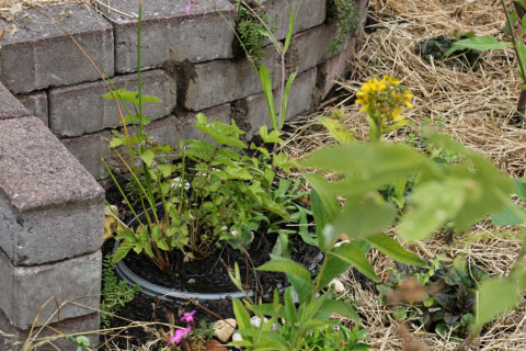 Das Sumpfbeet wurde mit heimischen Pflanzen wie Froschlöffel, Mädesüß oder auch heimischen Schwertlilien und Binsen bepflanzt. Da es schwierig ist, Insektentränken kindersicher einzubauen, war dies eine gute Alternative, um den Insekten eine Möglichkeit zur Wasseraufnahme zu ermöglichen.
