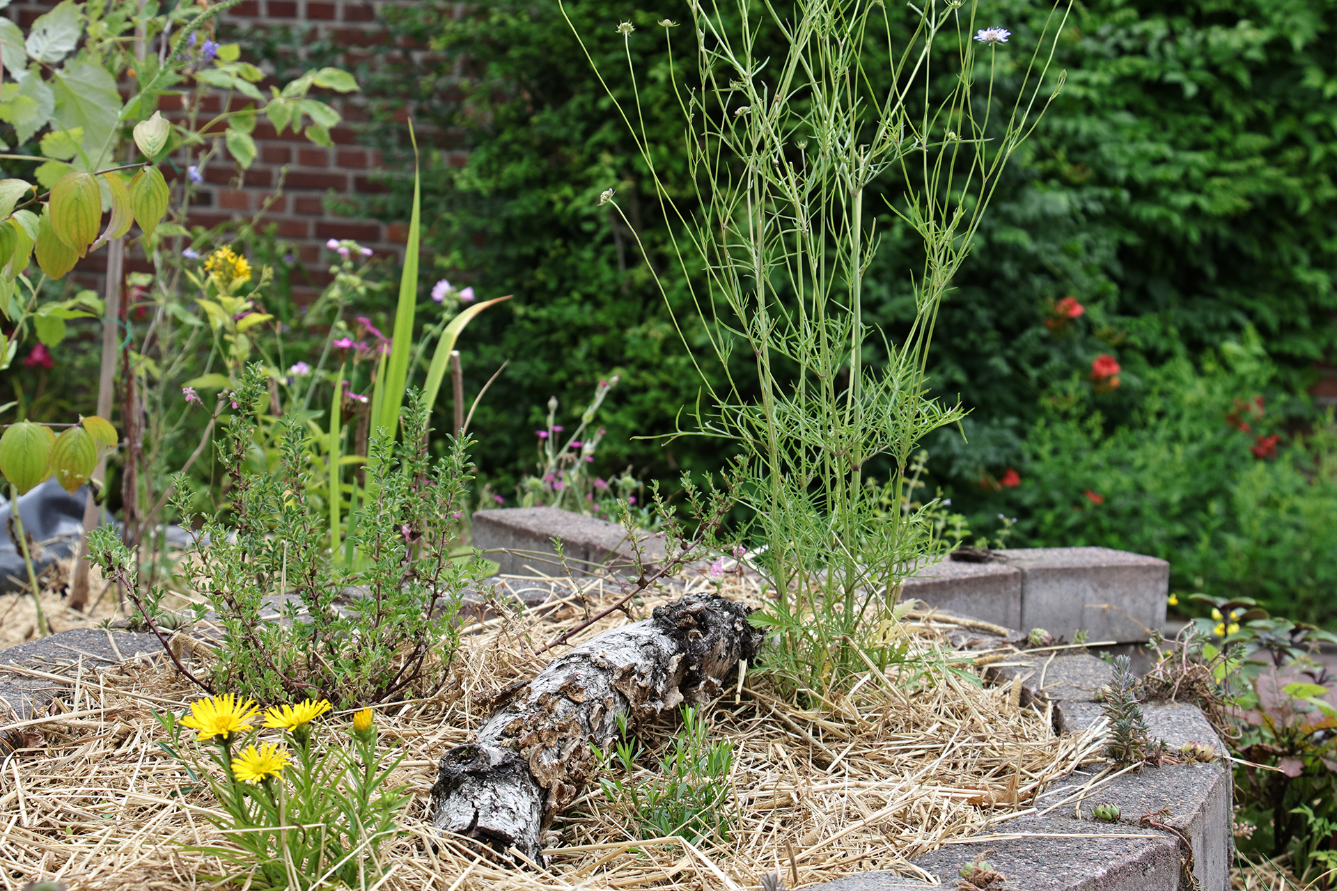 Der Bereich mit Sonnenstauden bekommt die meiste Sonne ab. Dieser Teil des Beetes ist der trockenste. Hier wurden Pflanzen angesiedelt und gesät, die mit Trockenheit sehr gut zurechtkommen.