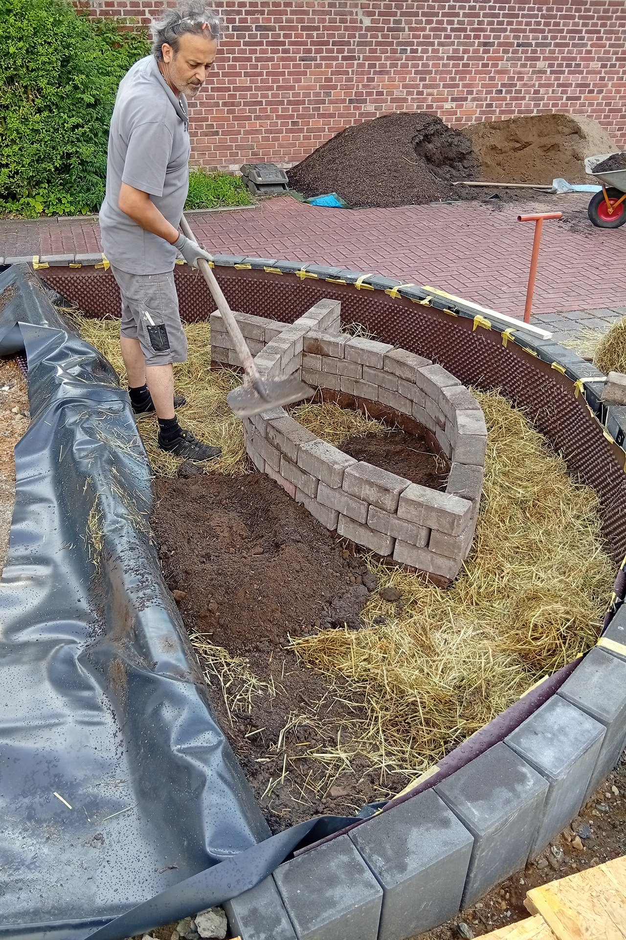 Die Erde ist eine spezielle Mischung, die bei der Planung erarbeitet wurde. Abgestimmt auf Standort und die Kombination mit Heu. Sie besteht aus Kompost mit etwas Holzanteil und dem hier typischen Lehmsandgemisch.