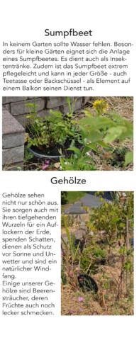 Sumpfbeete sind eine schöne Möglichkeit, das Element Wasser mit ins Spiel zu bringen. Insekten können sich mit Wasser versorgen.