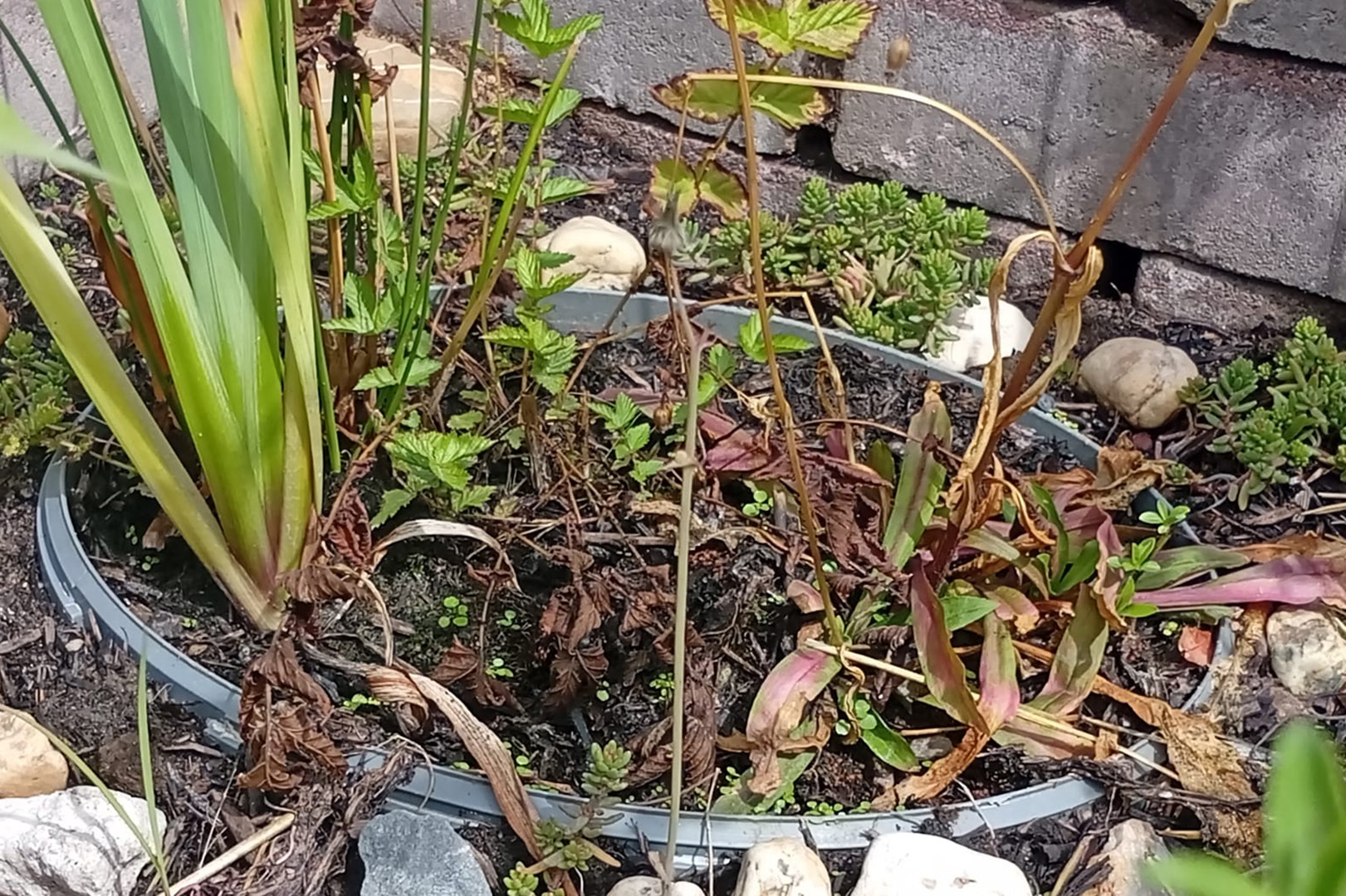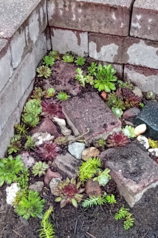Kleiner Steingarten mit Sedum und Sempervivum.