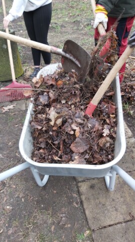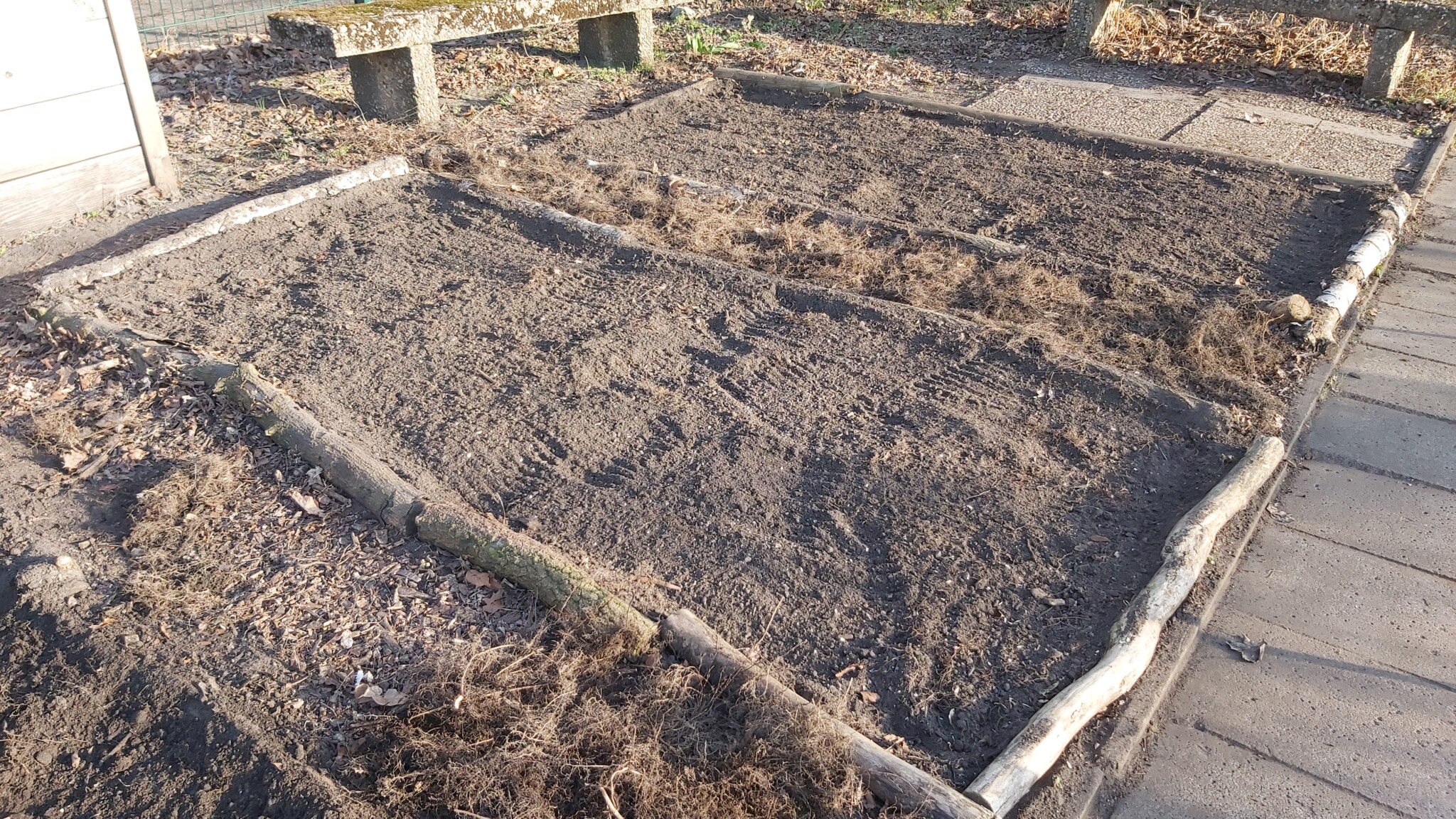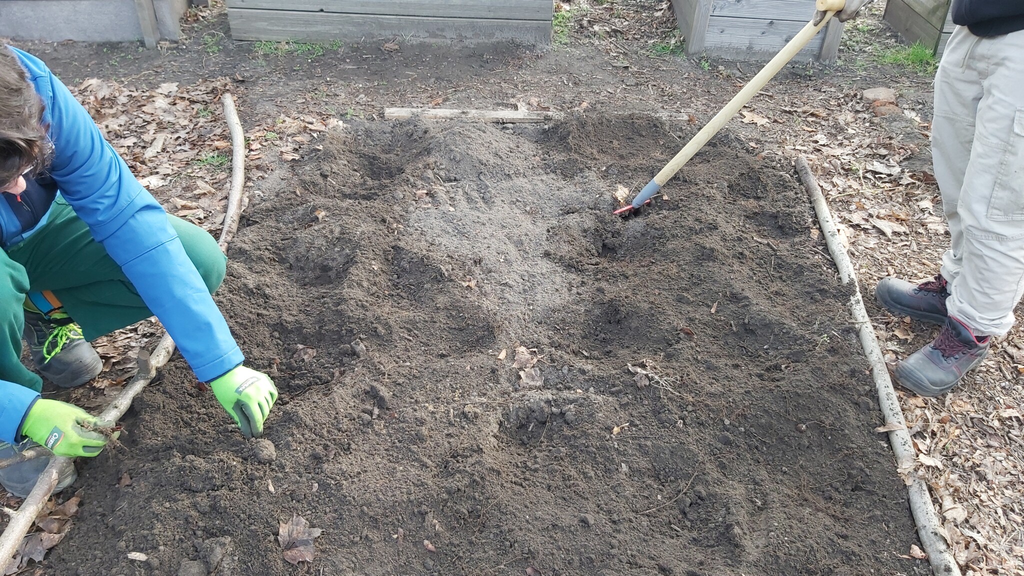 Wir haben die Freilandflächen zur Vorbereitung auf die Aussaat umgegraben, Steine und Müll entfernt und die Pflanzkästen mit Komposterde gefüllt.