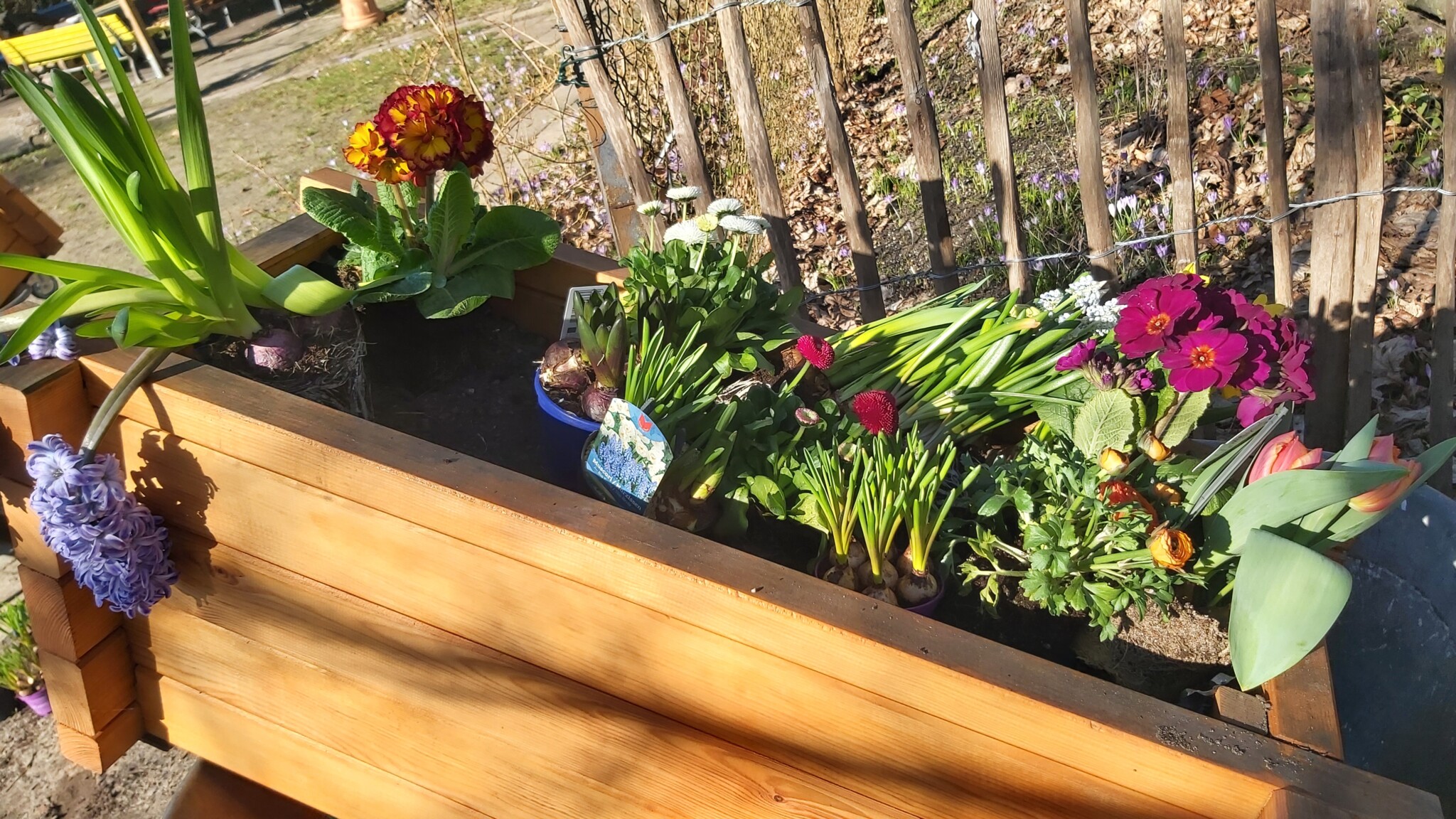 Im September haben wir Zwiebeln und Knollen von Frühjahrsblühern gesetzt und im März des Folgejahres mit frischen Pflanzen ergänzt.