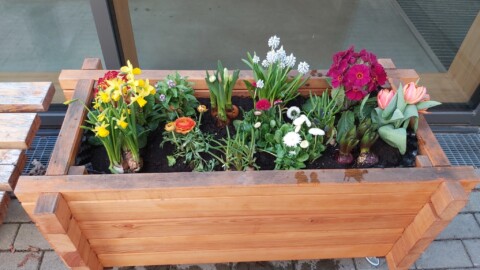 Unser Technikfachbereich hat diese Jahr extra für unsere Bepflanzungen im Eingangsbereich Holzkästen angefertigt, die wir im März mit Frühjahrsblühern bepflanzt haben.